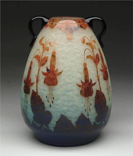 LE VERRE FRANCAIS FRENCH CAMEO VASE. Art Deco stylized fuschia flowers in orange to indigo mottled on maize to blue mottled background. Two applied purple handles. A nice big example. Acid-etched signature "Le Verre Francais" on the foot rim. SIZE: 12" t. CONDITION: Some acid burning to top of handles (original to the making, otherwise very good to excellent. 5-62397