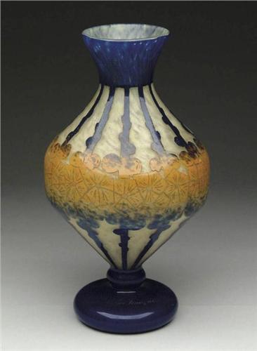 LE VERRE FRENCH CAMEO VASE. Art Deco pattern of hollyhocks decorating this unusually shaped vase. Colors of cobalt blue and orange are set against a soft mottled yellow background. Signed “Le Verre Francais” in script. SIZE: 13-3/4” t. CONDITION: Very good to excellent. 5-61732