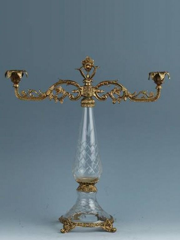 ITALIAN LEAD CRYSTAL CANDLEHOLDER - HAND CUT DESIGN - BRASS BASE AND CANDLEHOLDERS - 16.5L" x 5.5W" x 17H"