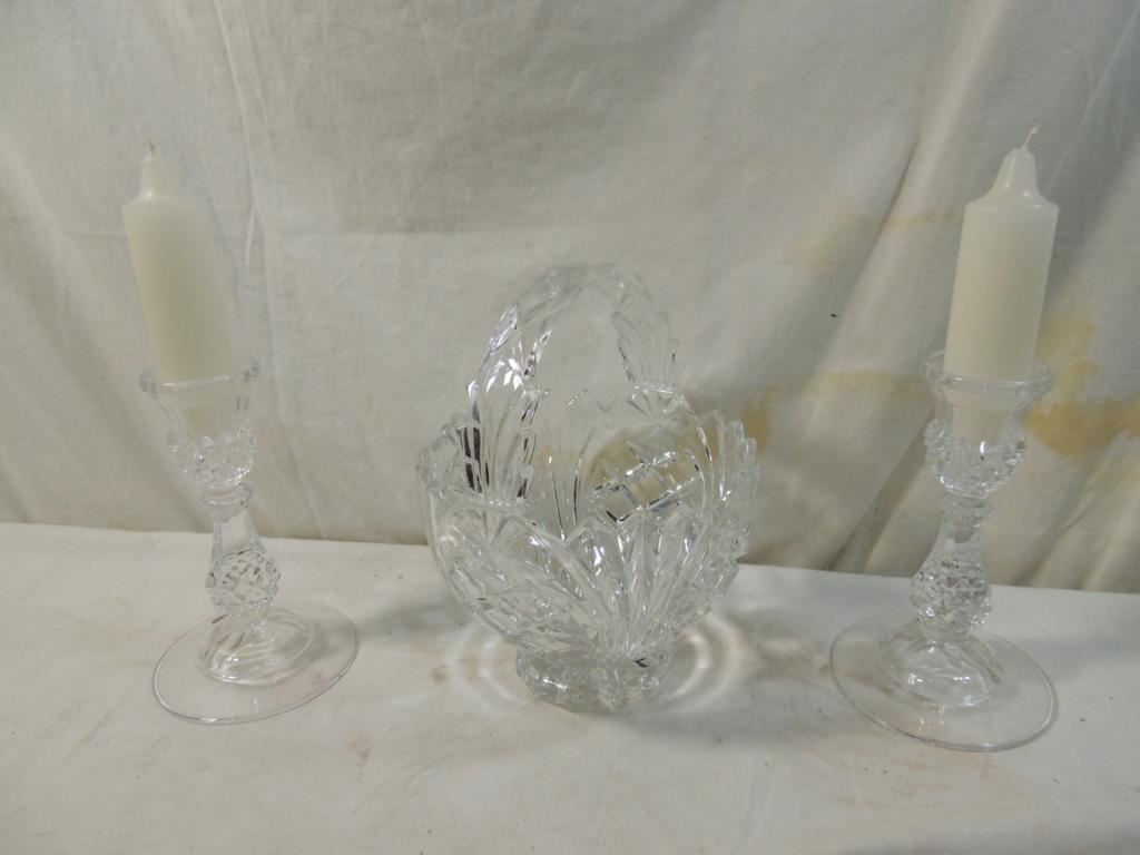CRISTAL D ARQUES FRANCE LEAD CRYSTAL CANDLESTICKS AND BOWL BASKET BOWL, PRESSED CRYSTAL AS SHOWN SEE PHOTO FOR MORE DETAILS.