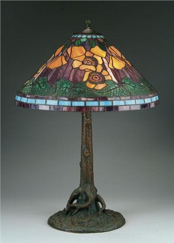 LEADED AND OVERLAID POPPY TABLE LAMP. Nice decorative contemporary table lamp has orange poppies against a purple slag background and green leaves. Poppies and leaves are overlaid with metal design. Shade has a border of light blue square tiles at the top and a skirt of light blue and purple. Shade rests atop a tree trunk base in cast white metal with bronze patina. SIZE: Shade is 20-1/2 in. dia. Overall height is 29 in. CONDITION: Sockets have been replaced, otherwise very good to excellent. Estate of Edwin Schiebel Sr. 5-60002