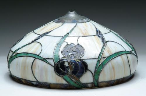 LEADED GLASS LAMP SHADE. Table lamp size in domed shape with blue irises against a white and caramel streaked background. Nice quality. Unsigned but made by Lyn Hovey Studios, Hyde Park, MA. SIZE: 7in. h x 14-1/2in. dia. CONDITION: Very good. 9-26350