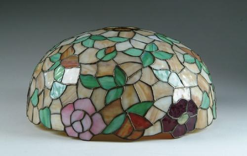 LEADED GLASS LAMP SHADE. Beautiful dome shaped leaded shade has carmel colored background, green leaves and a row of pink, red and orange flowers circling the uneven border. SIZE: 18 in. dia. CONDITION: Very good to excellent. 5-60833