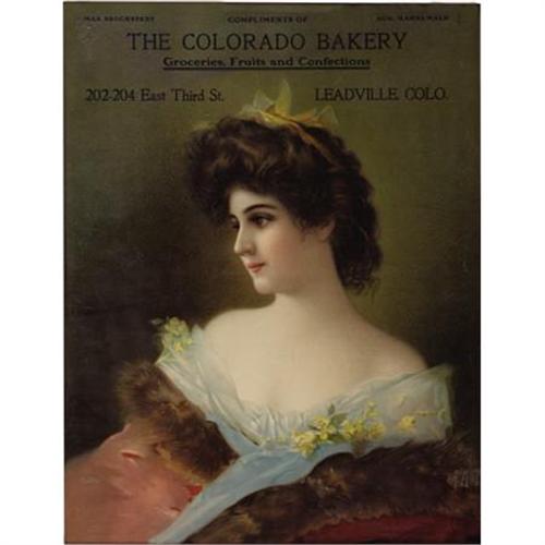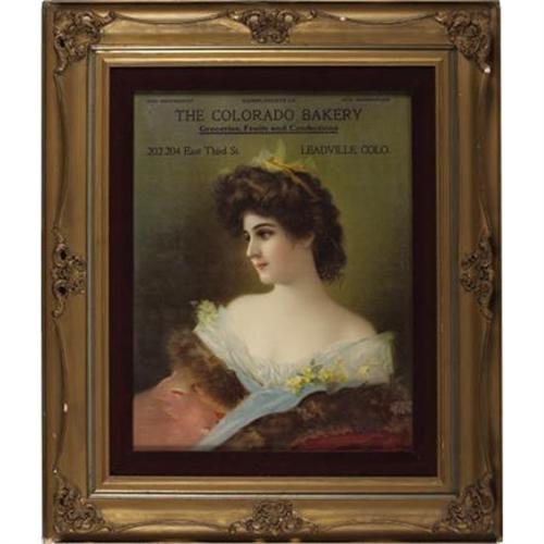 <B>LEADVILLE COLORADO ADVERTISING</B></I> - The Colorado Bakery: 17½” x 13½” image of colorful Victorian woman as common for the time. Circa 1890; Shows some creases but bright; Gold molded frame of the period; Not inspected out of frame.<BR><BR><b>Shipping:</b> Framed - with Glass, Large (<a target="_blank" href="http://www.heritageauctions.com/common/shipping.php">view shipping information</a>)