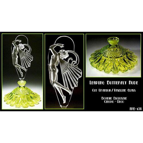 Our EXCLUSIVE - not available at any store or by any other seller!!! This "Leaping Butterfly Nude" perfume bottle is probably most beautiful from ALL Czech perfume bottles ever made and earned to be placed on the front cover page of the original Czechoslovakian Perfume Bottles and Boudoir Accessories by J. North . Design of crystal stopper is breathtaking, "vaseline (uranium)" glass bottle is hand cut to the perfection. Intaglio of Butterfly Nude is acid etched (just like the vintage piece) and unlike other contemporary pieces, which are sandblasted. Both - stopper and bottle are from the original 1930's molds and exclusively available by BOHEME or RAM, a founder of the original molds. Size : 8-1/2"H. MINT condition. Reference: Czechoslovakian Perfume Bottles and Boudoir Accessories by J. North - Revised Edition, page 157, # 902, page 50, #365 ($2500-$2800.00). This "Butterfly Leaping Nude" is also available with cut "aqua" or "tanzanite" blue or base, please see our other listings, we have close to 100 perfume bottles listed on GoAntiques site.... Again, we are the only source for this magnificent work of ART.....