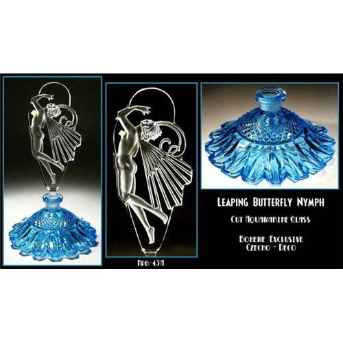 Our WORLWIDE EXCLUSIVE - not available at any store or by any other seller!!! This "Leaping Butterfly Nymph"(yes, there is proper ENGLISH word to describe this subject, a word widely used in Art/Glass field and among Collectors, but we are not allowed to use it in the title or desription...) perfume bottle is probably most beautiful from ALL Czech perfume bottles ever made and earned to be placed on the front cover page of the original Czechoslovakian Perfume Bottles and Boudoir Accessories by J. North . Design of crystal stopper is breathtaking, aqua blue crystal bottle is hand cut to the perfection. Intaglio of Winged Butterfly Female is acid etched (just like the vintage piece) and unlike other contemporary pieces, which are sandblasted. Both - stopper and bottle are from the original 1930's molds and exclusively available by BOHEME or RAM, a founder of the original molds. Size : 8-1/2"H. MINT condition. Reference: Czechoslovakian Perfume Bottles and Boudoir Accessories by J. North - Revised Edition, page 157, # 902, page 50, #365 ($2500-$2800.00). This "Leaping Butterfly Nymph" is also available with cut "vaseline" or "tanzanite" blue glass base, please see our other listings, we have close to 100 perfume bottles listed on GoAntiques site.... Again, we are the only source for this magnificent work of ART.....Original (un-retouched) pictures without the bar over the chest available on request.