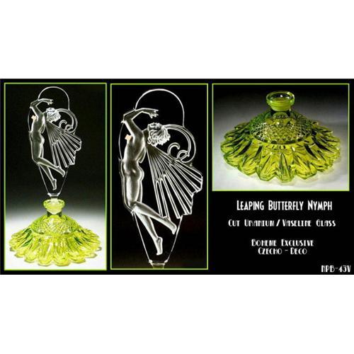 Our WORLWIDE EXCLUSIVE - not available at any store or by any other seller!!! This "Leaping Butterfly Nymph"(yes, there is proper ENGLISH word to describe this subject, a word widely used in Art/Glass field and among Collectors, but we are not allowed to use it in the title or desription...) perfume bottle is probably most beautiful from ALL Czech perfume bottles ever made and earned to be placed on the front cover page of the original Czechoslovakian Perfume Bottles and Boudoir Accessories by J. North . Design of crystal stopper is breathtaking, "vaseline (uranium)" glass bottle is hand cut to the perfection. Intaglio of Winged Butterfly Female is acid etched (just like the vintage piece) and unlike other contemporary pieces, which are sandblasted. Both - stopper and bottle are from the original 1930's molds and exclusively available by BOHEME or RAM, a founder of the original molds. Size : 8-1/2"H. MINT condition. Reference: Czechoslovakian Perfume Bottles and Boudoir Accessories by J. North - Revised Edition, page 157, # 902, page 50, #365 ($2500-$2800.00). This "Leaping Butterfly Nymph" is also available with cut "aqua" or "tanzanite" blue glass base, please see our other listings, we have close to 100 perfume bottles listed on GoAntiques site.... Again, we are the only source for this magnificent work of ART.....Original (un-retouched) pictures without the bar over the chest available on request.