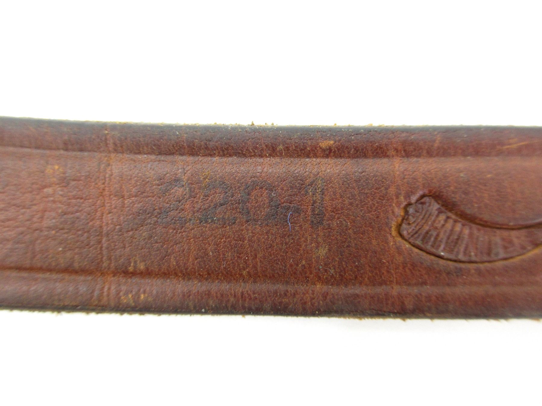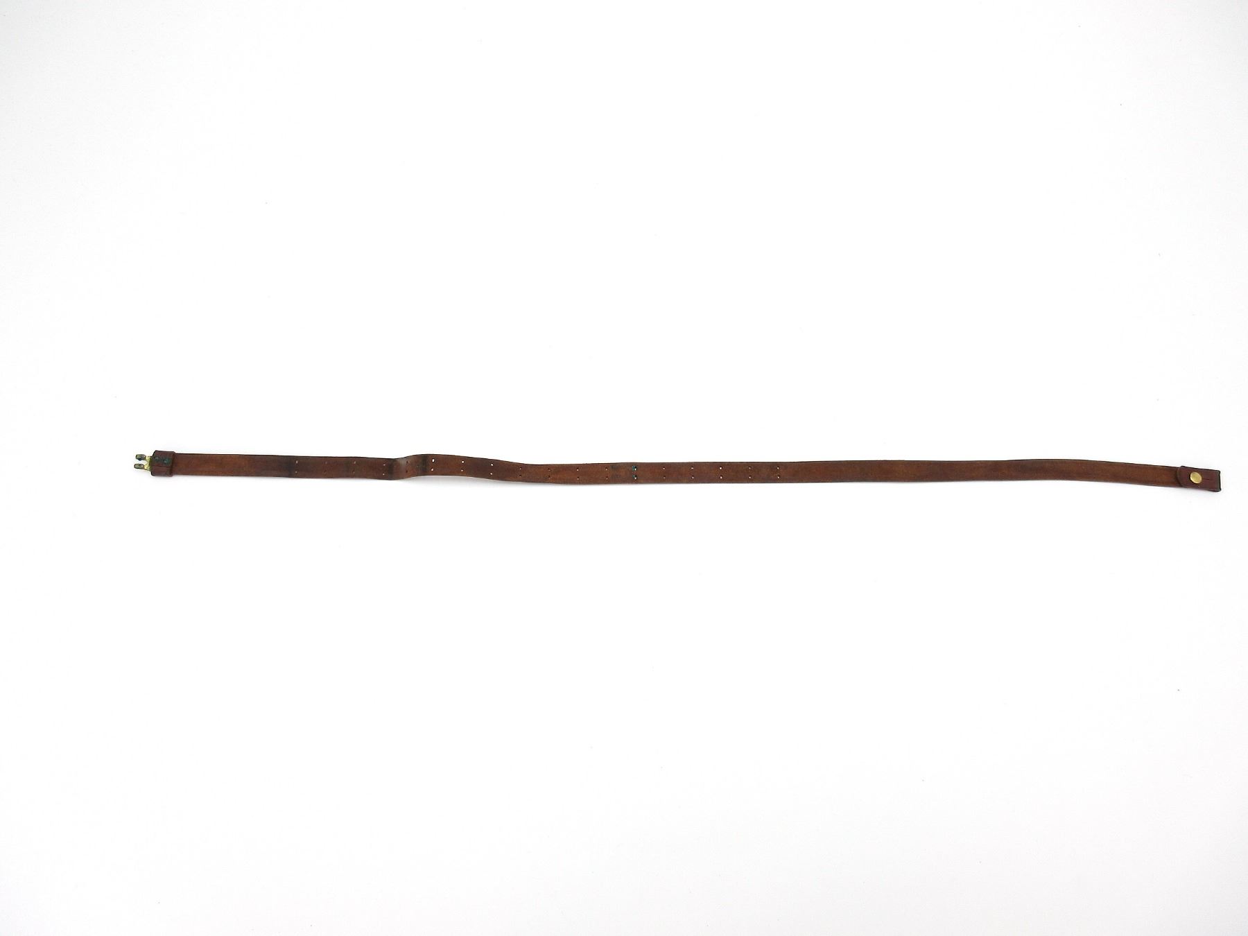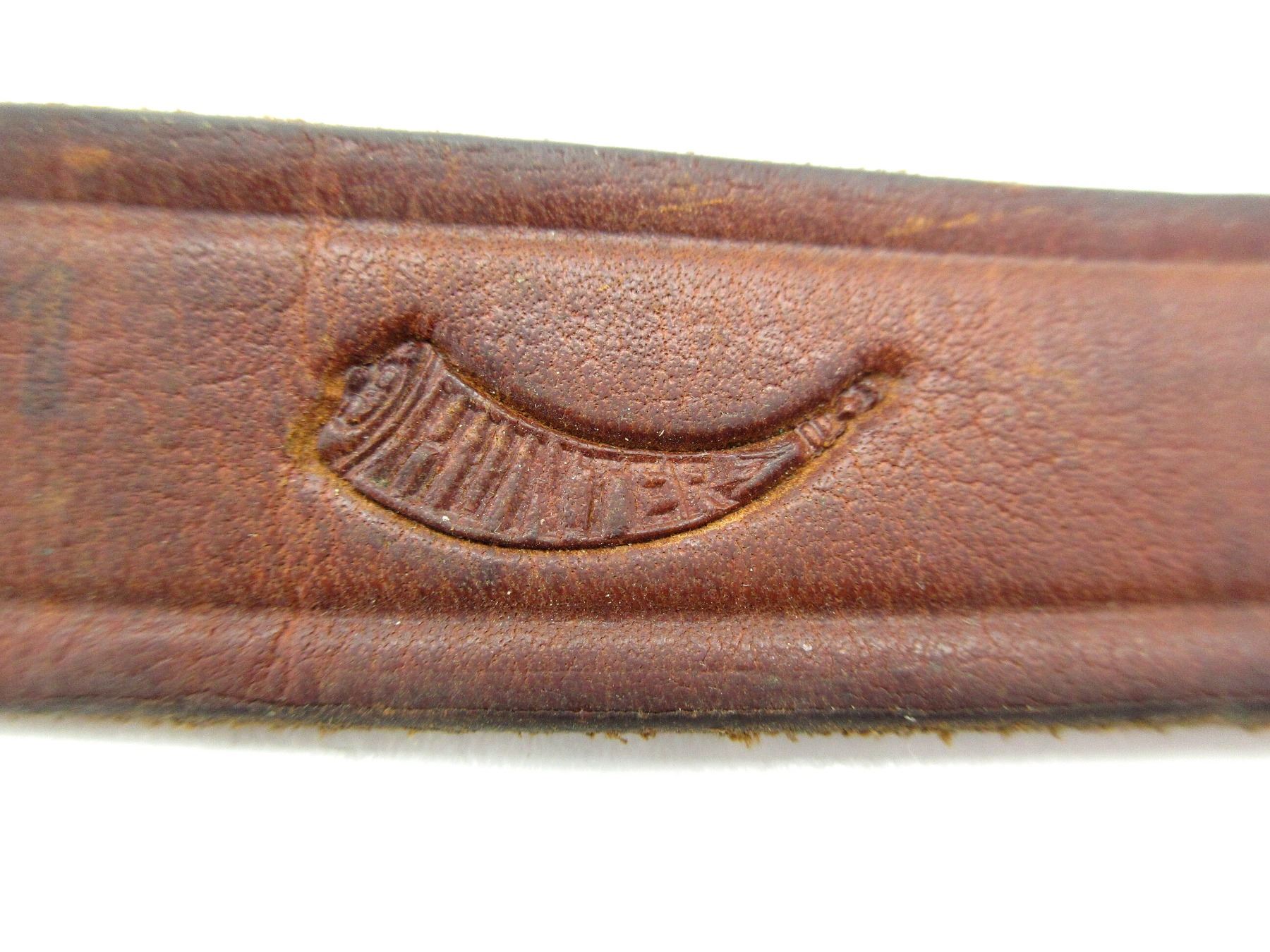 (1) BROWN LEATHER SLING WITH BRASS FITTINGS, MARKED: "220-1" & "HUNTER" IN POWDER HORN SHAPE, OAL APPROX. 48", ADJUSTABLE. SEE PHOTOS.