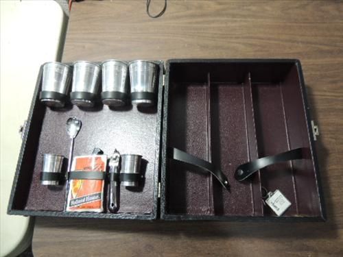 LEATHER CASE 3 BOTTLE WHISKEY HOLDER & ALUMINUM GLASSES. AS SHOWN. VIEW PICTURE FOR DETAIL.