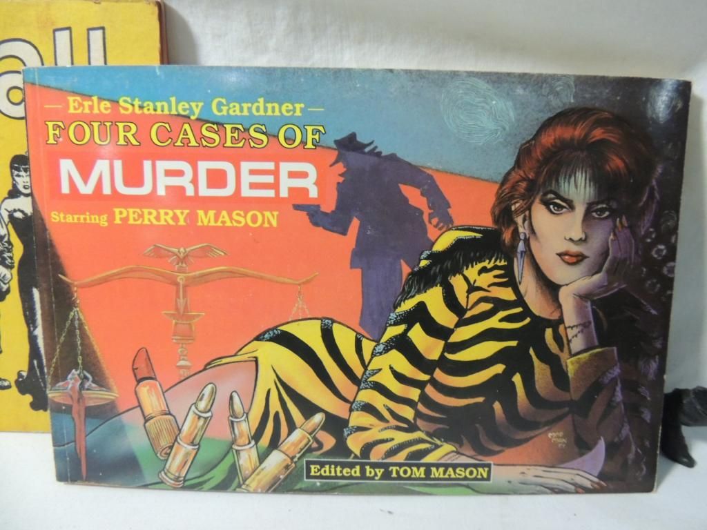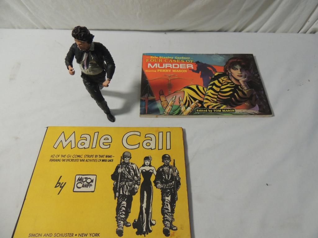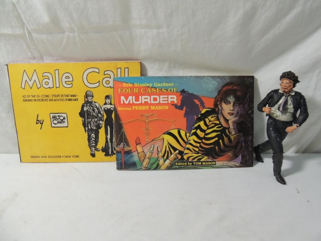 ERLE STANLEY GARDNER FOUR CASES OF MURDER STARRING PERRY MASON. LEATHER FACE DETAILED ACTION FIGURE, MALE CALL 112 OF THE GI COMIC STRIPS BY THAT NAME FEATURING THE EFFORTLESS WAR ACTIVITIES OF MISS LACE BY MILTON CANIFF. VINTAGE BOOKS. AS SHOWN SEE PHOTO