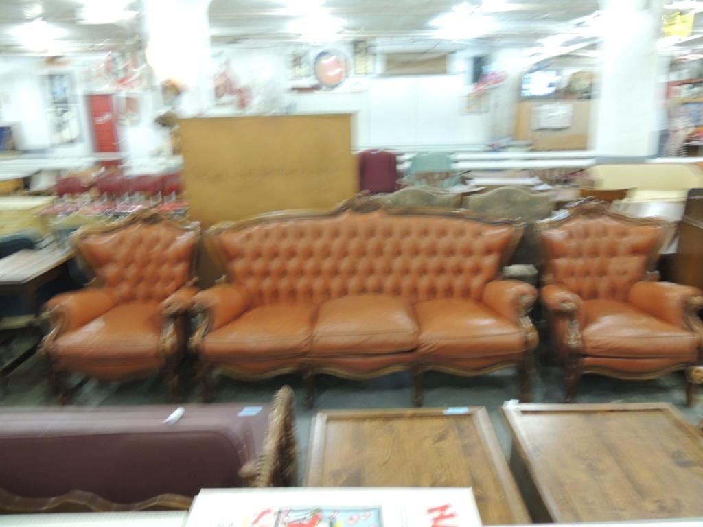 VINTAGE LEATHER SOFA AND TWO CHAIRS. TUFFED BACK. LEATHER VICTORIAN STYLE. GREAT CONDITION. AS SHOWN. SEE PHOTO FOR MORE DETAILS.
