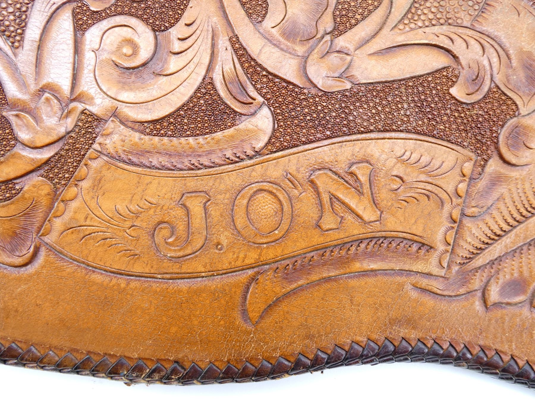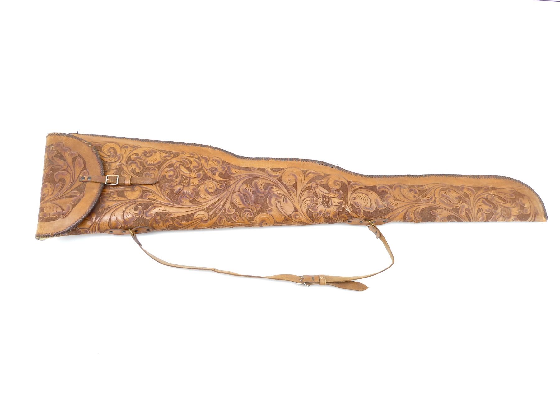 LOT INCLUDES; (1) LEATHER SOFT PADDED GUN CASE, SHOULDER STRAP, STRAP & BUCKEL, APPROX. OVERALL LENGTH 49", SHOWS WEAR AND TEAR FROM USAGE, SEE PHOTOS