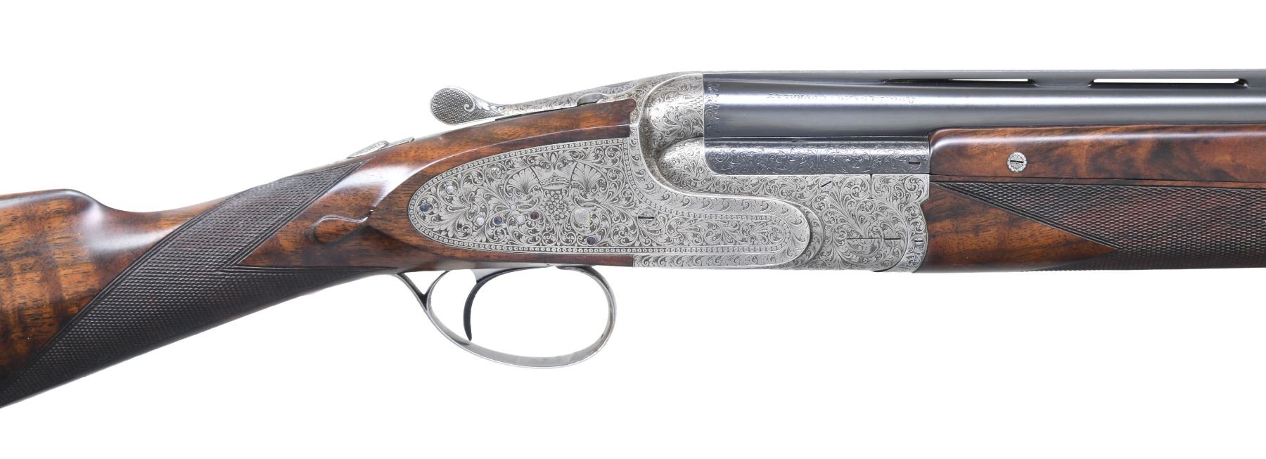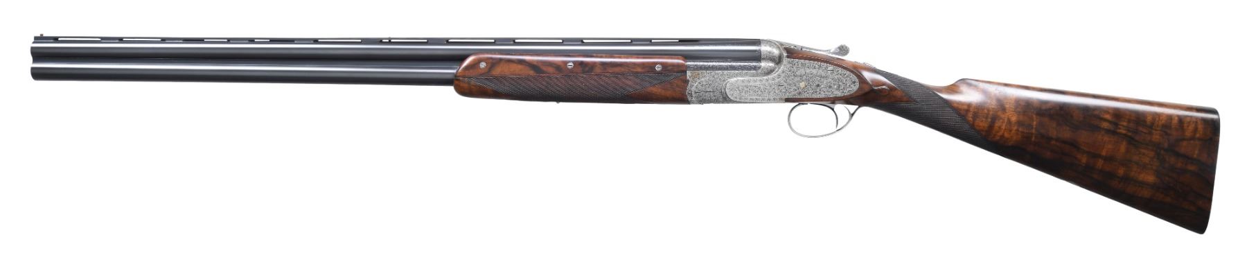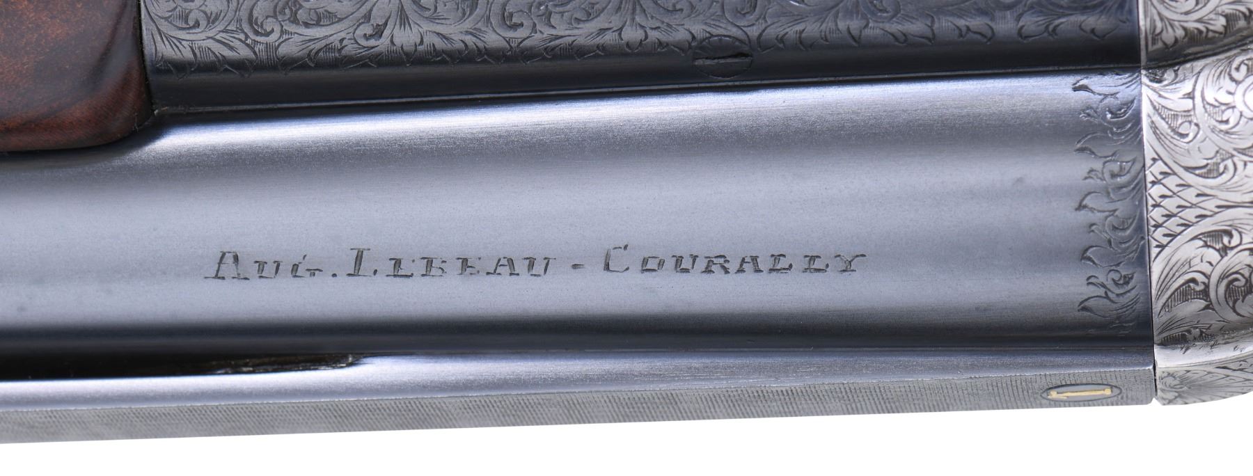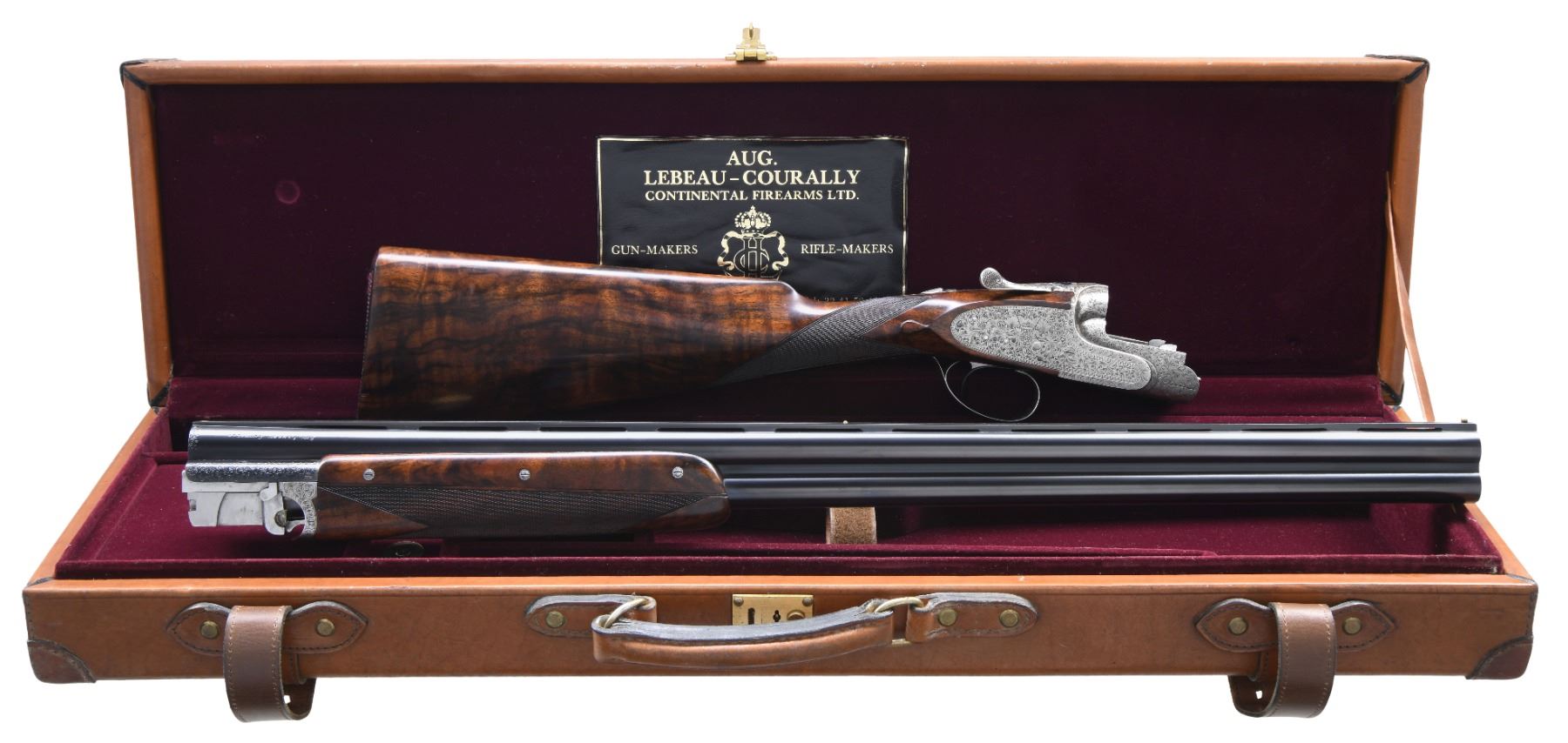 GUN WITH CASE. Cal. 12 Ga. 2-3/4". S# 43408 (Circa 1955). This very nicely made gun has 27-5/8" demi-block barrels fitted with flat matted ventilated rib. Top barrel is engraved "Aug. Lebeau-Courally" "Armes de Grand Luxe-Liege". The number "1" is gold inlaid at rear of rib. Barrel flats are marked with maker's name and address along with Lebeau Courally logo. No proofs are present. Bottom of bottom barrel is marked with S#, provisional proofs, choke information and steel type "DE WAHLREYNE". Choke percentages "53%/68%" are stamped in front of loop. Coin finish low profile Boss type action with back spring sidelocks features non-automatic safety ("SAFE" inlaid in gold), gold plated internals and single non-selective mechanical trigger. Action and lockplates are engraved with full coverage very nicely cut shaded scroll which surrounds crown and acanthus devices which are found on bottom of action and lockplates. Engraver's signature "H. Wery" is on trigger plate. Maker's name is not on exterior of action but is stamped in barrel well. Belgian proofs are on watertable. S# is on trigger guard tang. Very nicely figured and marbled European walnut straight grip buttstock measures 14-3/4" over checkered wood butt and features drop points, point pattern grip checkering and vacant silver oval. Matching three piece ejector forend has Deeley release. MEASUREMENTS: BBLS: Bore Diameter: O .732. U .730. Restriction: O .025 (mod). U .005 (IC). Wall thickness: O .026. U .027. STOCK: DAH: 2-1/2". DAC: 1-1/2". CAST: about 5/8" off. LOP: 14-3/4". WEIGHT: 7 lb. 0 oz. UNATTACHED ACCESSORIES: gun is housed in a tan leather case with stitched leather corners; lined in burgundy velvet. A Lebeau-Courally Continental Firearms Limited label is in lid. Bottom compartment is semi-French fitted and contains a pair of snap caps, empty bone striker bottle and a key. CONDITION: fine as lightly refurbished. Barrels with nearly all good quality re-black. Action lightly cleaned to coin finish. Wood retaining nearly all oil re-finish. Checkering competently re-cut. Bores are bright and shiny without noted problems. Action is tight; barrels on face. Under ejector does not fire. Case is fine with some spots and marks on exterior. Straps and handle are good. Interior cloth is good with light soiling and compressions. Label is partially detached. (25-932/MGM). CURIO. $7,000-12,000.