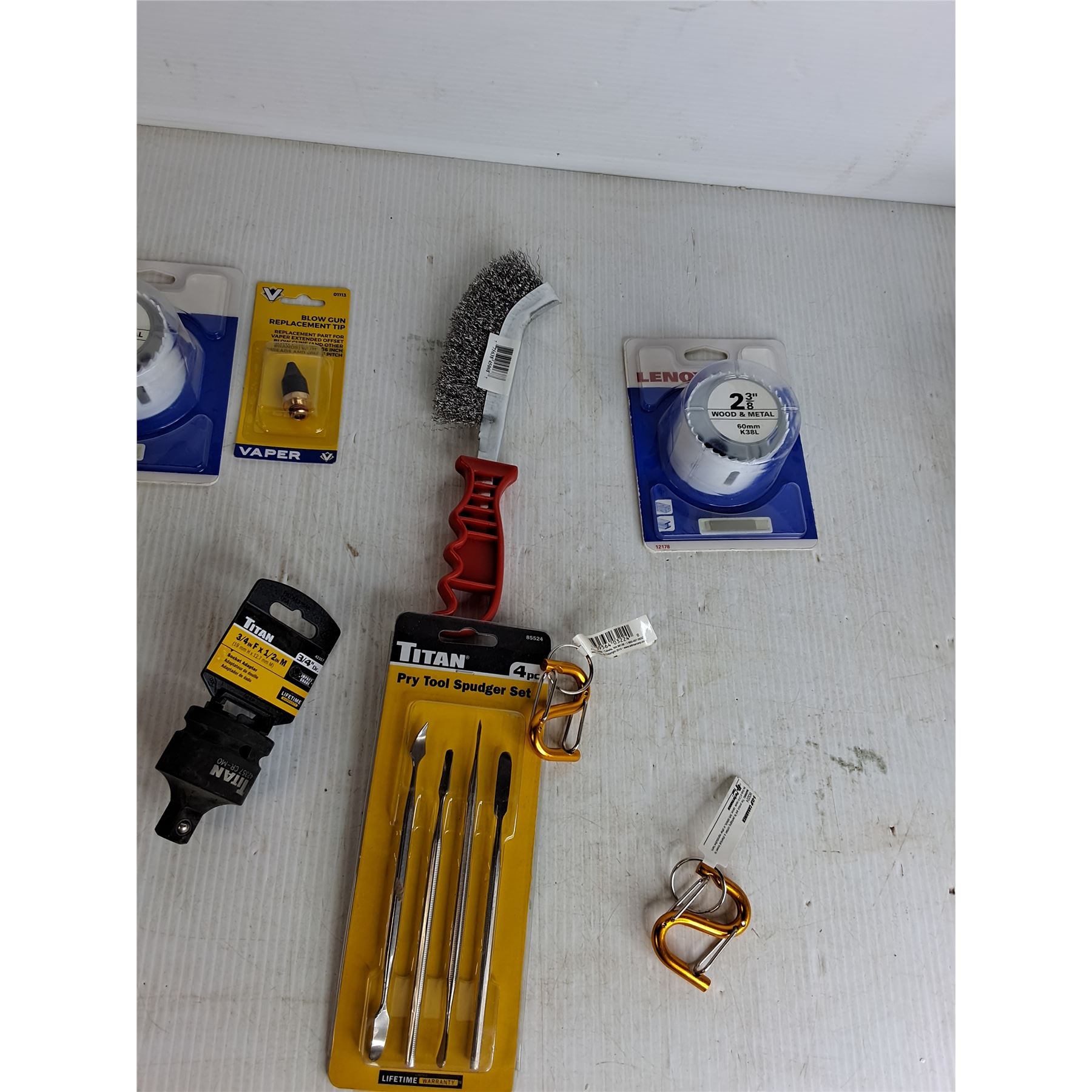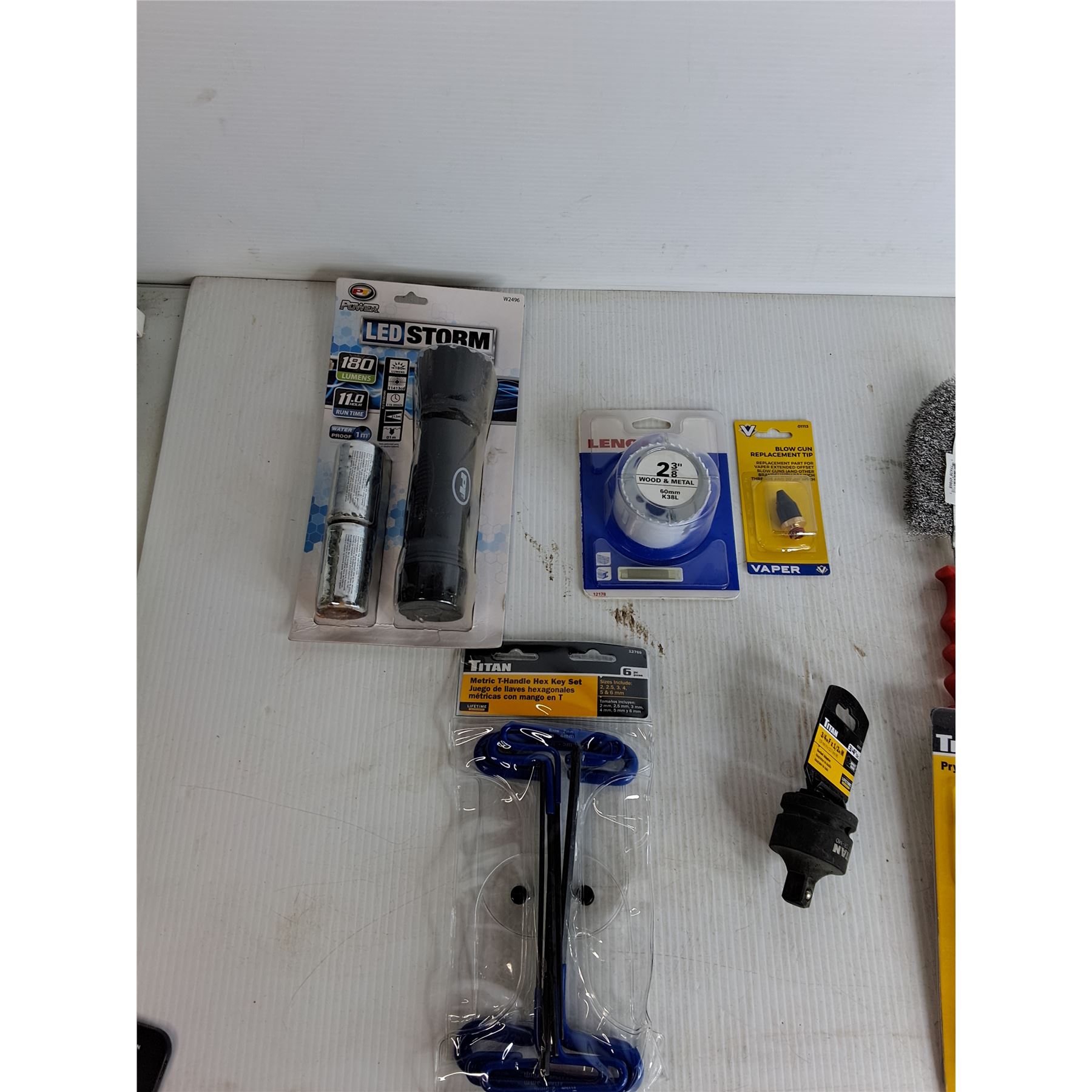 LED Flashlight, 2 3/8" Lenox Hole Saw, Blow Gun Relpacement Tip, Wire Brush, Misc