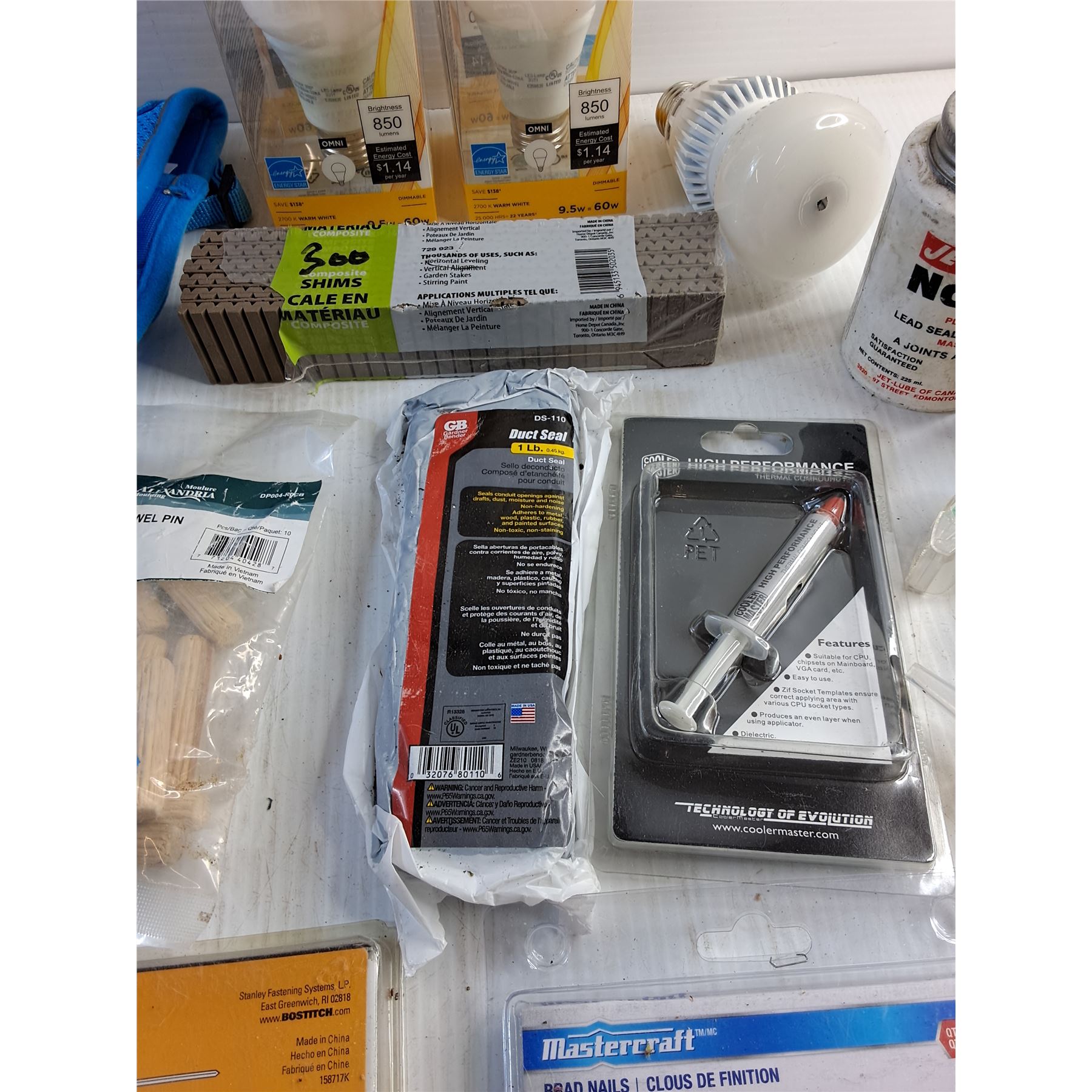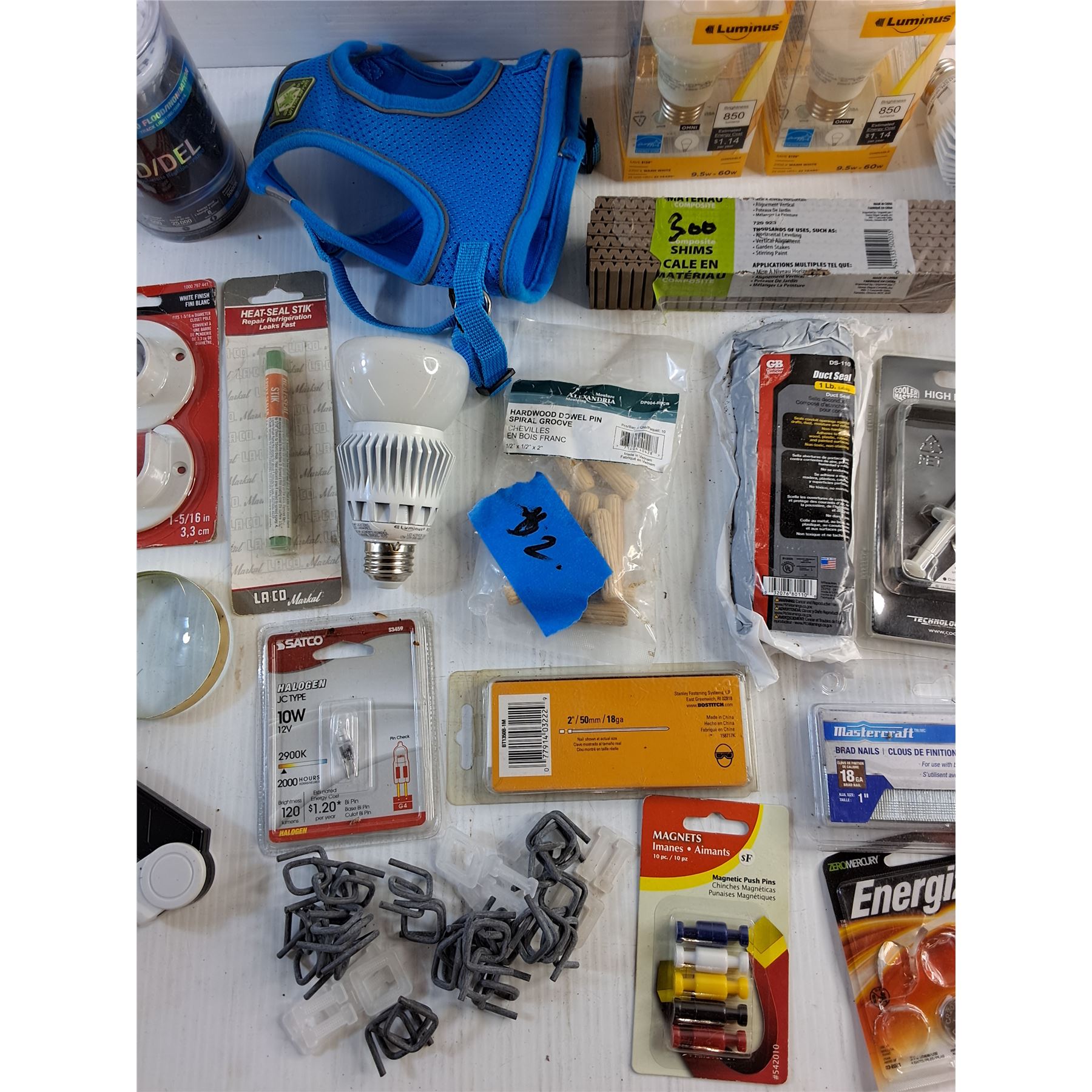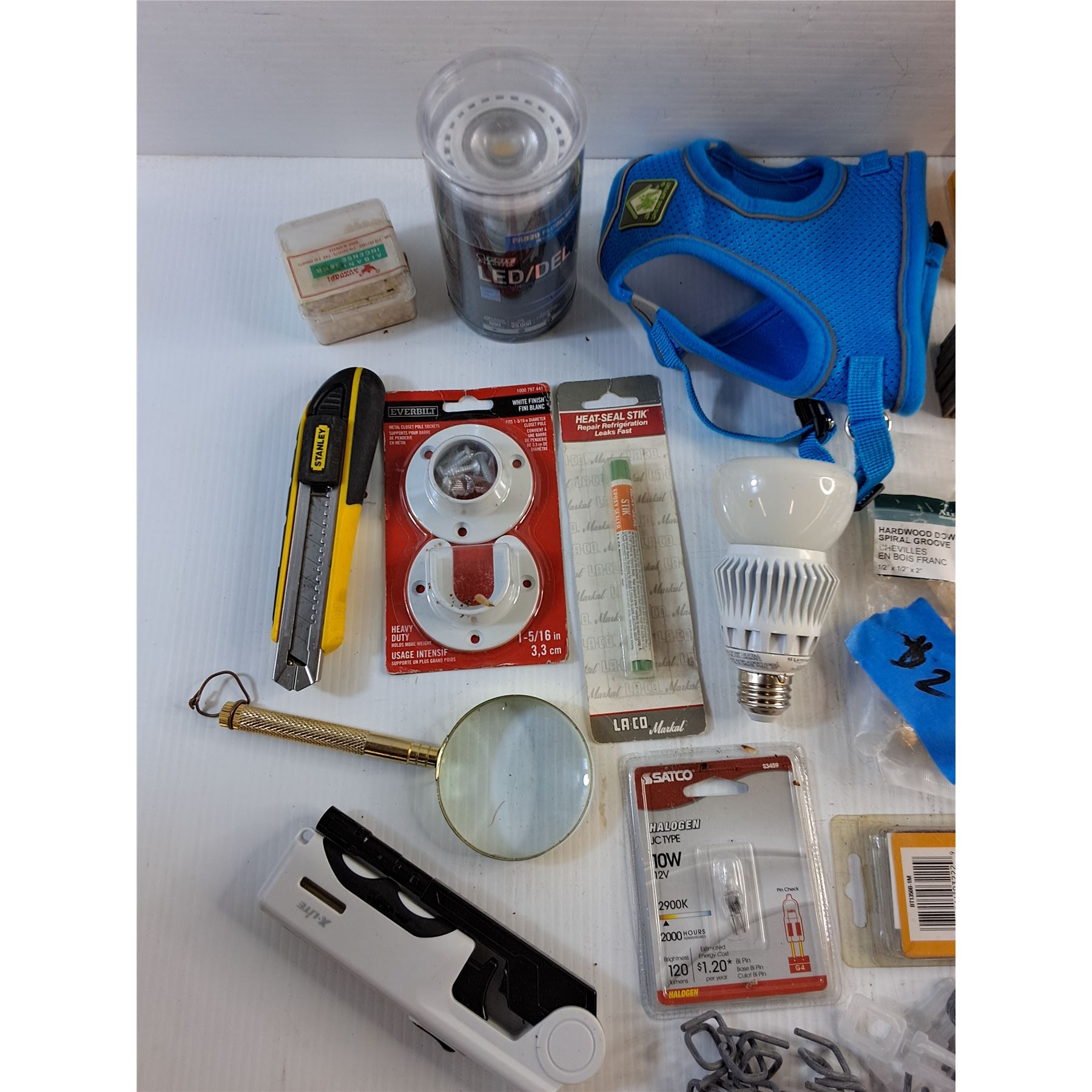 LED Light Bulbs, Box Cutter, Magnifying Glass, Brad Nails, Duct Seal, Pet Harness and Misc