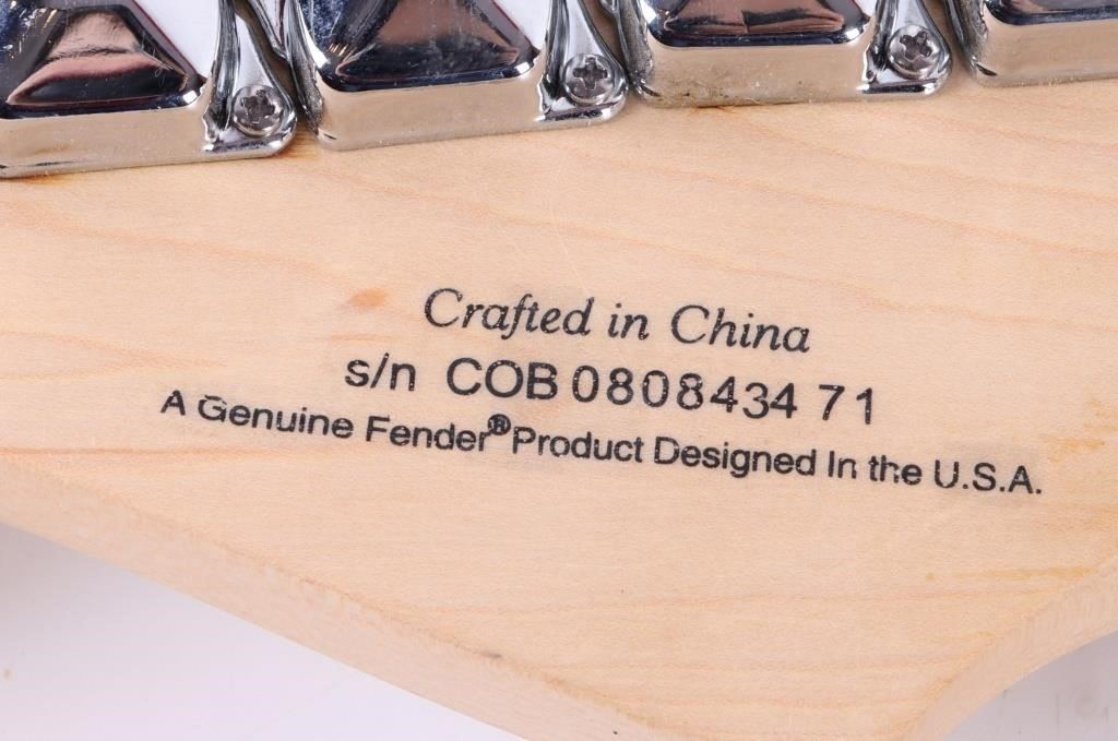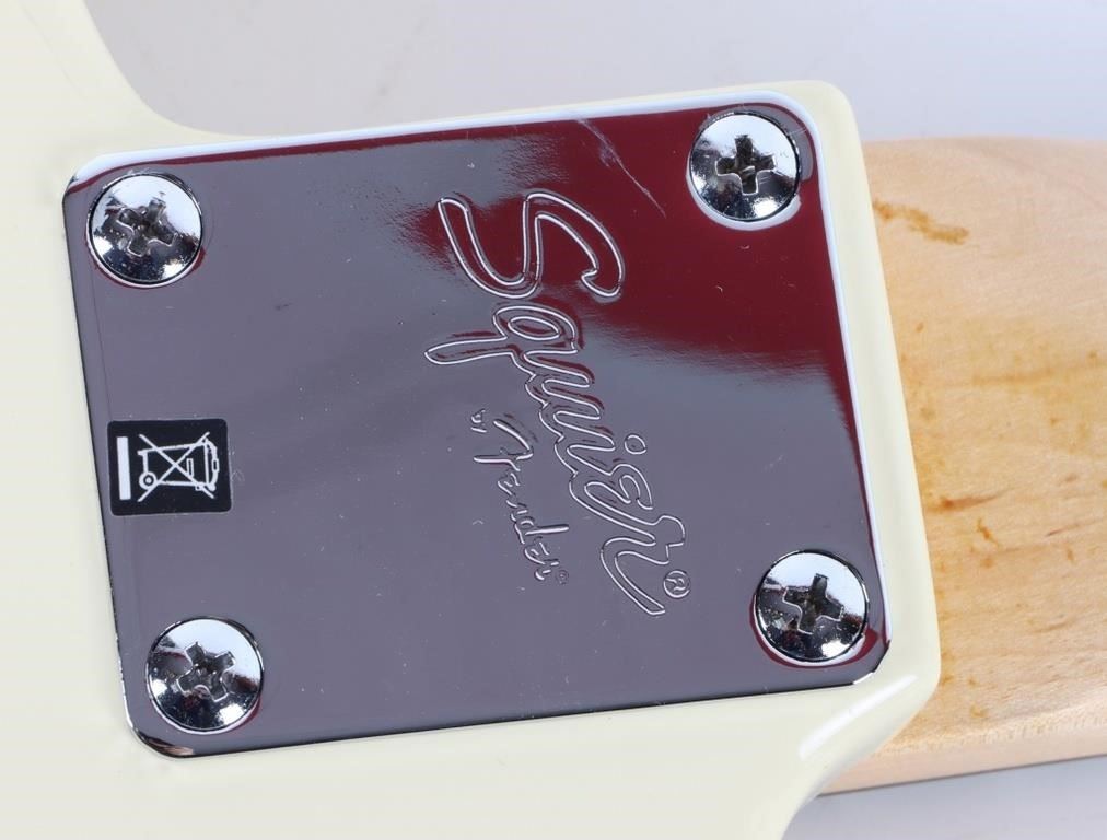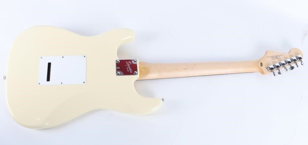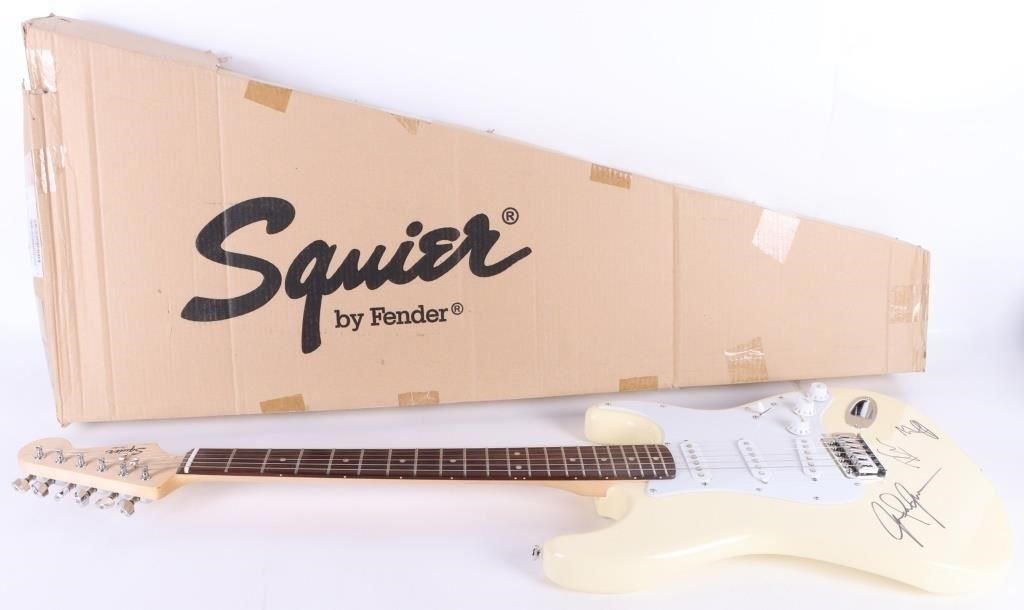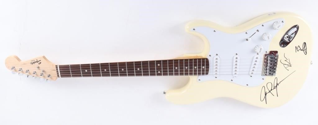 Led Zepplin 2005 signed Squire Fender guitar. Guitar is signed by all members currently. Guitar is cream and white. Authenticated by Elite. Authentication sticker is on the side of the guitar.
