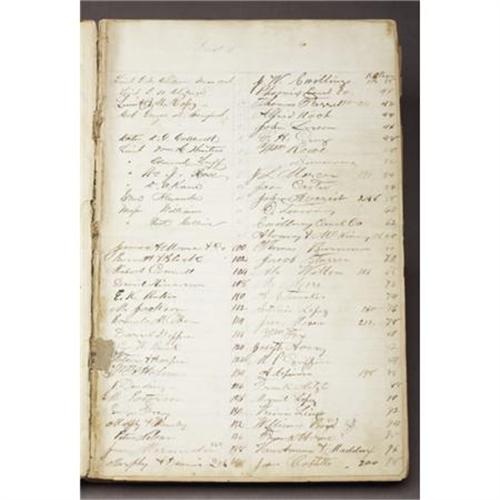 <B>LEDGER OF WILLIAM A. HANCOCK ONE OF FOUNDING FATHERS OF PHOENIX, ARIZONA. 1869-1870.</B></I><BR><BR><B>Hancock, William A.</B></I> In November 1864, Hancock enlisted in the 7th Regiment of Infantry, California Volunteers, in San Francisco and was soon posted to Fort Yuma, California. The following September he was transferred ton an Arizona regiment and was commissioned second lieutenant of Company āCā 1st Regiment of Arizona Volunteers. Under the command of Lieutenant John Walker, this unit consisted of eighty-two Pima Indians, including their chief Azul as first sergeant, and forty citizen Pimas.<BR><BR>As part of the garrison command by Lieutenant Colonel Clarence E. Bennett and ordered to establish a new post in the Tonto Basin, Hancock and his Pimas arrived at the site of what would become Fort McDowell.<BR><BR>William Hancock remained at fort McDowell as post sutler until 1869, and it is during his tenure as the McDowell storekeeper that this account ledger begins. With the relocation and regarrisoning of Camp Reno in the Tanto basin, Hancock signed a contract in August, 1869, to build a store and become post sutler there. He completed and stocked his store just as Camp Reno was deactivated and the town of Phoenix was created. Nevertheless, the ledger from this period (1869-1870) contains detailed accounts for many of Reno & McDowell officers including General Andrew J. Alexander, Colonel George B. Sanford, Major James M. Williams, Major Patrick Collins and Lieutenant George W. Chilson. A very rare and early historical item form Arizona Territory. 8āx 12ā.<BR><BR><B>Condition:</B></I> There are 239 pages, original boards front cover separated, overall condition is very good.<BR><BR><b>Shipping:</b> Books & Catalogs (<a target="_blank" href="http://www.heritageauctions.com/common/shipping.php">view shipping information</a>)