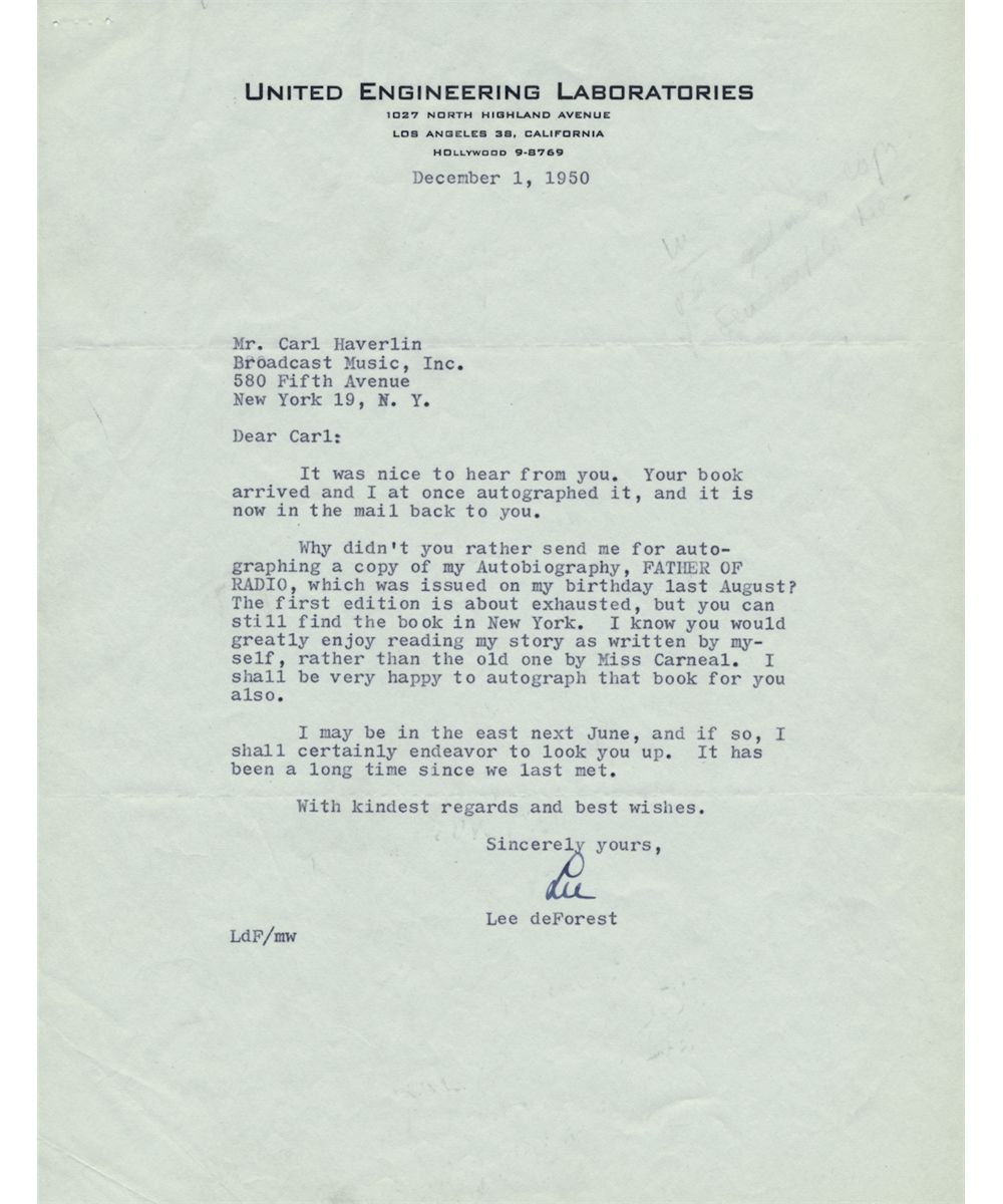 (1873-1961) Prolific American inventor, most notably of the Audion that would eventually bring sound to motion pictures. T.L.S. 1p. 4to., Los Angeles, Dec. 1, 1950, on letterhead of his company, United Engineering Laboratories, to Carl Haverlin of Broadcast Music in New York. In part: "...It was nice to hear from you...Your book arrived and I at once autographed it...Why didn't you rather send me for autographing a copy of my Autobiography, Father of Radio, which was issued on my birthday last August?...". Boldly signed "Lee" in blue fountain ink, fine.