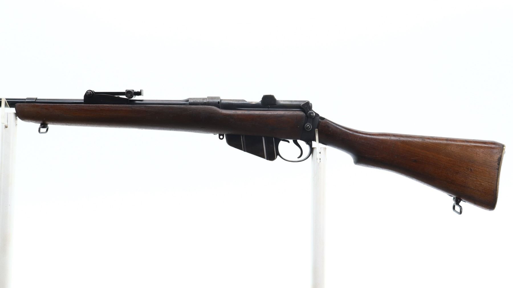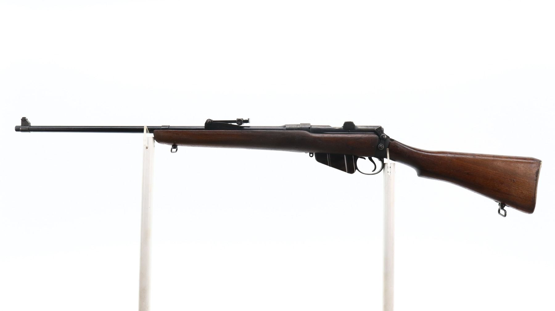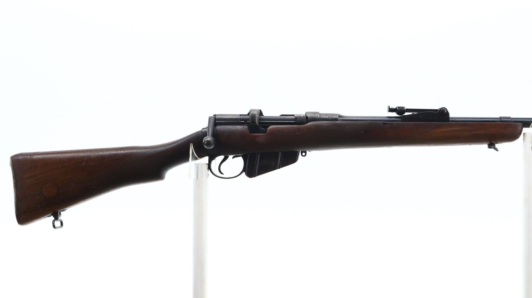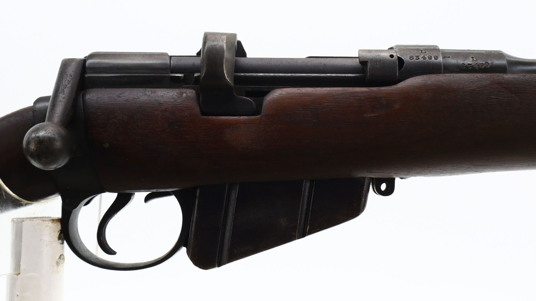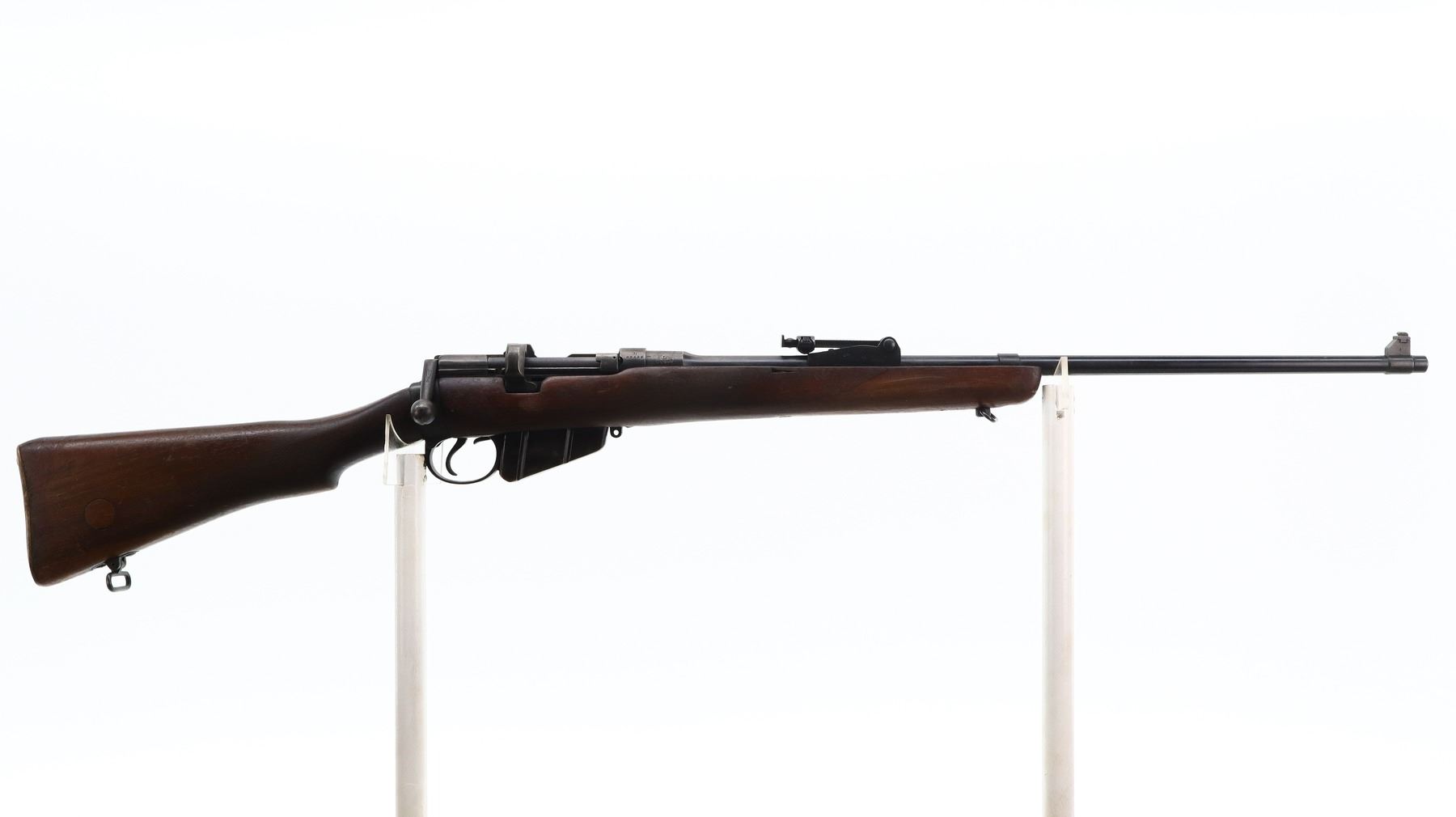 5/10, LEE ENFIELD, MODEL: NO1 MKIII SPORTER, CALIBER: 303 BR, COMES WITH MAGAZINE, BORE IS VERY GOOD. MANUFACTURED BY BSA 1940, BOLT MATCHES. BLADE FRONT SIGHT WITH RAMP, ADJUSTABLE U NOTCHED REAR SIGHT, MISSING COMPLETE FIRING PIN ASSEMBLY. TWO PIECE SPORTERIZED WOOD STOCKS, PISTOL GRIP, SMOOTH BRASS BUTT PLATE WITH TRAP, STOCK DISK REPLACED, SLING SWIVELS. METAL FINISH SHOWS SOME SCRATCHES, HANDLING MARKS AND WEAR. STOCKS SHOW SOME MARKS, SCRATCHES AND WEAR. , ACTION: BOLT ACTION RIFLE, BARREL LENGTH: 25.25", SERIAL# L83499, CONDITION: 5/10, CLASS: CANADIAN NON RESTRICTED