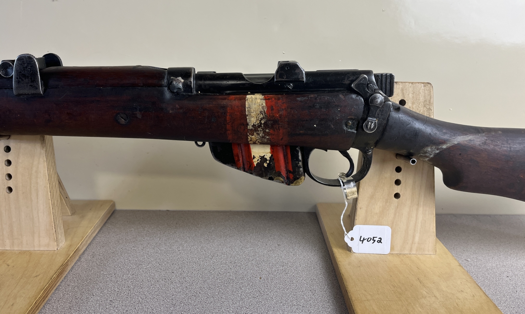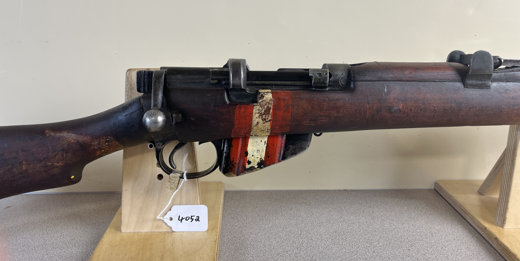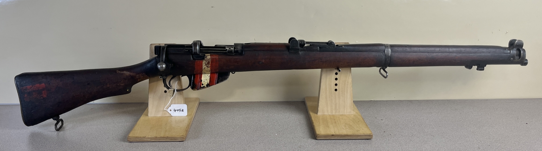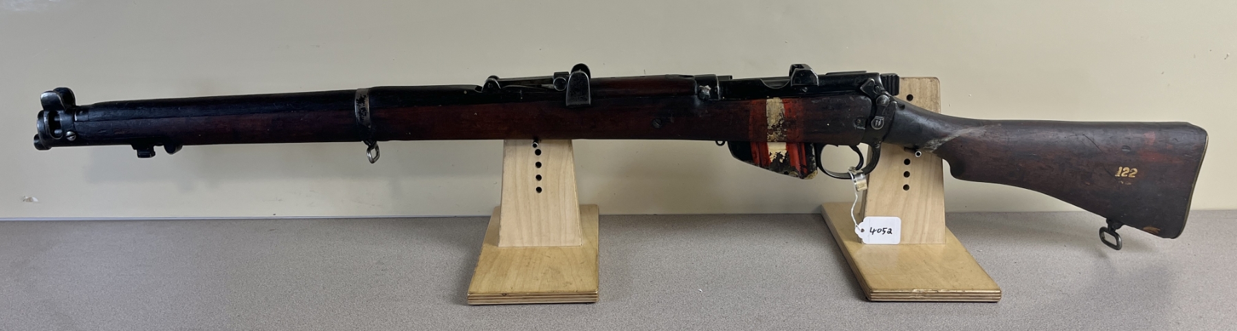 CONDITION: F OVERALL, BORE G. NOTE: WELDED PIN IN CHAMBER. SPECS: 25-1/4IN BBL. EXTRAS: NONE. S/N: 87657, RECEIVER AND FORESTOCK MATCH. SHOWS 122 ON LEFT SIDE OF BUTTSTOCK