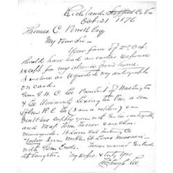 (1835 - 1905) Confederate major general and nephew of Robert E. Lee who directed troops in Stuart's ride around McClellan, and fought at Antietam and Gettysburg. He also cut his way out of Appomattox only to surrender two days later. Good content A.L.S. 1p. 4to., Richland, Oct. 21, 1876, to Thomas C. Powell, Esq., in part: "...Gen. G. W. C. Lee President of Washington & Lee University Lexington Va., a son of R. E. Lee (I am a nephew) can doubtless supply you with Gen. Lee's autograph and Maj. Tom Turner...with Gen. Ewell. Turner married Gen. Ewell's step-daughter...". Very slight toning to edge, else very good.