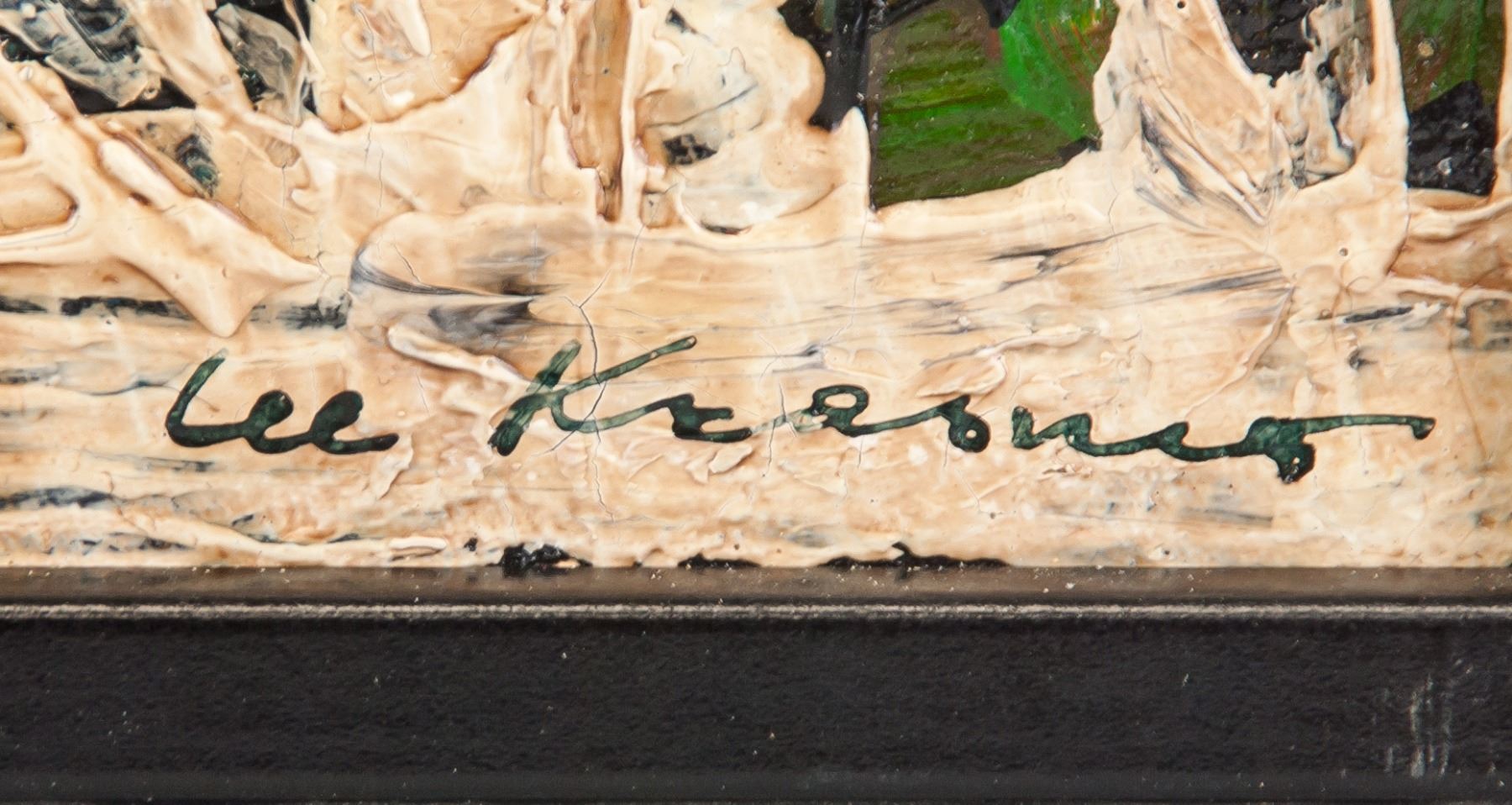 Oil on canvas, framed, featuring an abstract artwork, Signed and attr. Lee Krasner (American, 1908-1984), on the lower right corner. 19.5 x 15.6 in. (49.5 x 39.5 cm). Lee Krasner was a major figure in the American Abstract Expressionist movement and the wife of Jackson Pollock. Working in oil on canvas, ink on paper, and mixed-media collage, Krasner produced works characterized by a sensuous painterly style, her large-scales collages often formed from the artist’s own cut-up paintings and drawings. Krasner exhibited with the American Abstract Artists group, through which she met Pollock; the two became vital critics and supporters of one another, and Pollock’s influence on Krasner helped free her from formalist strictures.