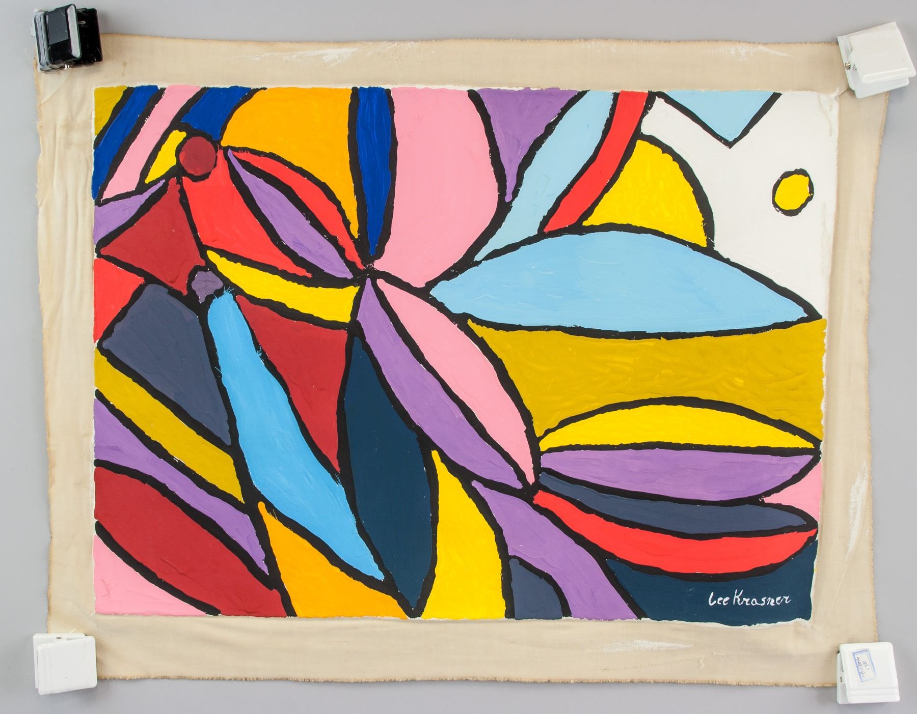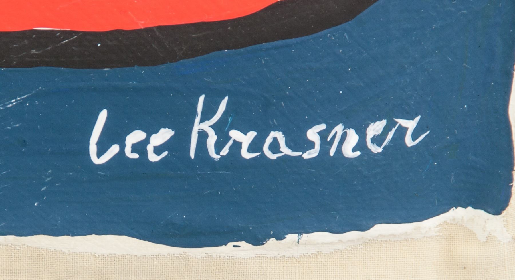 Oil on canvas. Abstract composition. Signed and attr. Lee Krasner (American, 1908-1984). 14 x 19 in. (35.6 x 48.3 cm). Lee Krasner was a major figure in the American Abstract Expressionist movement and the wife of Jackson Pollock. Working in oil on canvas, ink on paper, and mixed-media collage, Krasner produced works characterized by a sensuous painterly style, her large-scales collages often formed from the artist’s own cut-up paintings and drawings. Krasner exhibited with the American Abstract Artists group, through which she met Pollock; the two became vital critics and supporters of one another, and Pollock’s influence on Krasner helped free her from formalist strictures. “Painting…in which the inner and the outer man are inseparable, transcends technique, transcends subject and moves into the realm of the inevitable,” she said. Krasner studied under Hans Hofmann, and considered Henri Matisse and Piet Mondrian to be lifelong influences on her practice.