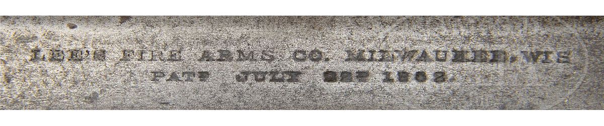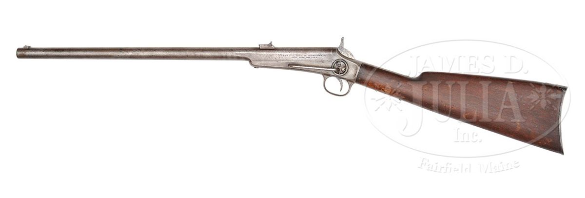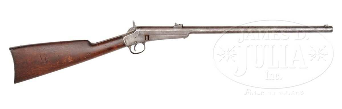 SN 1707. 44 Cal rimfire. This very scarce Civil War era carbine rarely comes to market and this is a nice orig example that conforms to other known examples with 21" round bbl that swivels to load. The bbl is marked "LEES FIREARMS CO. MILWAUKEE, WISC, PAT'D JULY 22, 1862". CONDITION: Gun is very good overall with gray metal. Gun functions mechanically with discernible rifling in bore. Stock is sound and solid with an old coat of varnish over a pair of carved initials "WD". Bbl markings are worn but discernible as can be seen in photos. Carbine sling screw appears to be a newer replacement. 4-49366 JS205