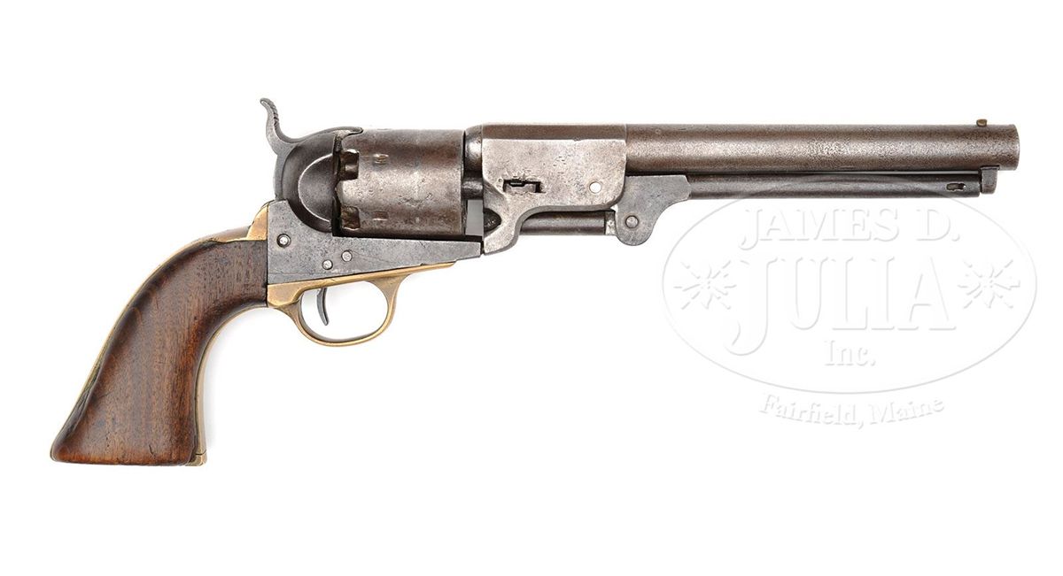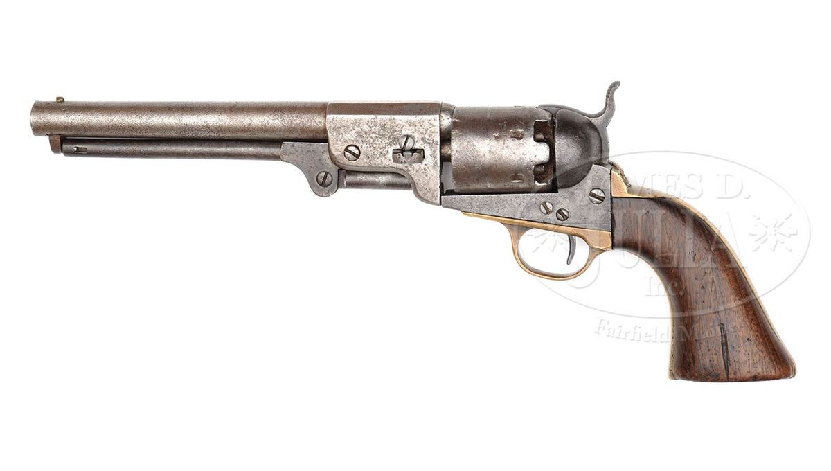 SN 825. Cal. 36. You are bidding on an orig and authentic Leech & Rigdon maker marked revolver. The firm of Leech & Rigdon started their pistol production in Memphis, TN and, being chased by advancing Union forces, moved their operations to Columbus, Miss. and then to Georgia where this gun was made. This gun is marked "LEECH & RIGDON CSA" on top flat of half-oct bbl housing. Matching SNs are found on bbl, loading arm, cylinder, frame, trigger guard, and backstrap. The "8" in SN's broken die & must have been replaced as SN 887 just 60 numbers different has perfect "8". The "8" has been confused as "6" before in literature. Gun appears all origi and authentic with apparent contemporary replaced latch and base pin. There is no SN present on wedge but it appears orig to gun's time of use. Stocks are orig with an old glued repair to the left grip. The maker markings on this gun are better than average, as can be seen in photos. CONDITION: Metal surfaces overall are cleaned, pitted with scattered scrapes and dings. All SN are discernible, though weak on cylinder. Gun is functional with a good bore and discernible rifling. Brass backstrap has scattered scratches, dings and scrapes. Brass trigger guard is smooth with a few scattered scratches and a four dot cryptic below SN. 4-48637 JS2