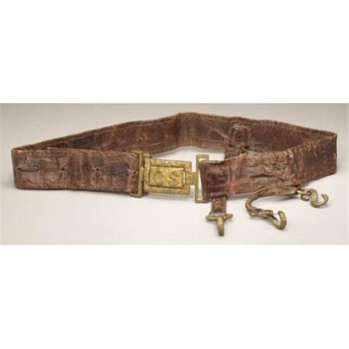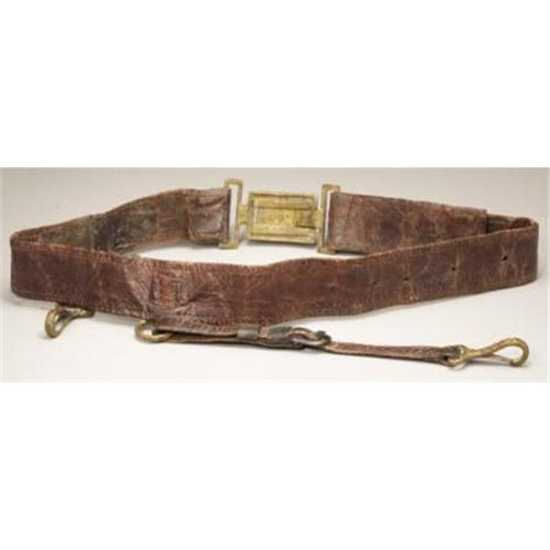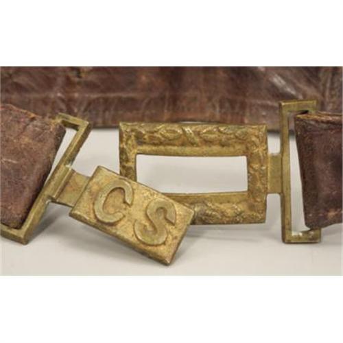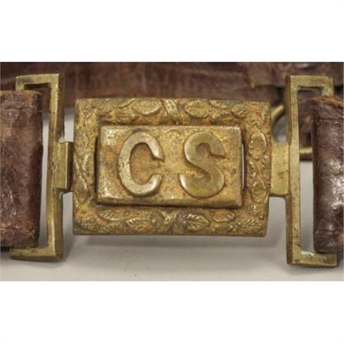 <B>VERY RARE LEECH & RIGDON TWO PIECE INTERLOCKING BUCKLE ON THE ORIGINAL SWORD BELT</B></I>. - Rather crude two piece cast brass plate, 90mm X 50mm, original leather belt, with two original suspensory straps, snap hooks with crudely cast relief decoration, attached to the belt with circular brass loops. S shaped brass suspension hook, crudely cast in the form of a snake, attached at the belt. The longer of the two straps utilizes a lacquered iron adjusting buckle. This very rare plate is the only rectangular design used in fabricating two piece Confederate buckles. A casting flaw between the C and S at the top edge of the tongue has been noted on other existing specimens. The original brown leather belt has a Moroccan style finish and incorporates a folded iron wire hook for adjusting. One of the rarest of all Confederate general service plates and one of only a handful of specimens extant on the original belt. Probably furnished early in the war, with a Memphis Novelty Works sword. An exceptional opportunity for the advanced collector.<BR><B><BR>CONDITION</B></I>: Completely untouched. All brass with a wonderful ‘attic’ patina, retaining traces of the original gilt in recessed areas. Steel snap hook springs, attached with small brass pins w/deep dark patina and some light scattered surface rust. Iron adjusting buckle on the long suspensory strap retains 50% of the original lacquer. Belt also untouched, very sound and supple with just a couple of noteworthy worn spots by the sword hangers, obviously the result of honest use.<BR><BR><B>Provenance:</B></I> <I>The Tharpe Collection of American Military History</B></I><BR><BR><B>Exhibited:</B></I> <I>The Liberty Heritage Society Museum</B></I> <BR><BR><b>Shipping:</b> Miscellaneous Collectibles, Smal (<a target="_blank" href="http://www.heritageauctions.com/common/shipping.php">view shipping information</a>)