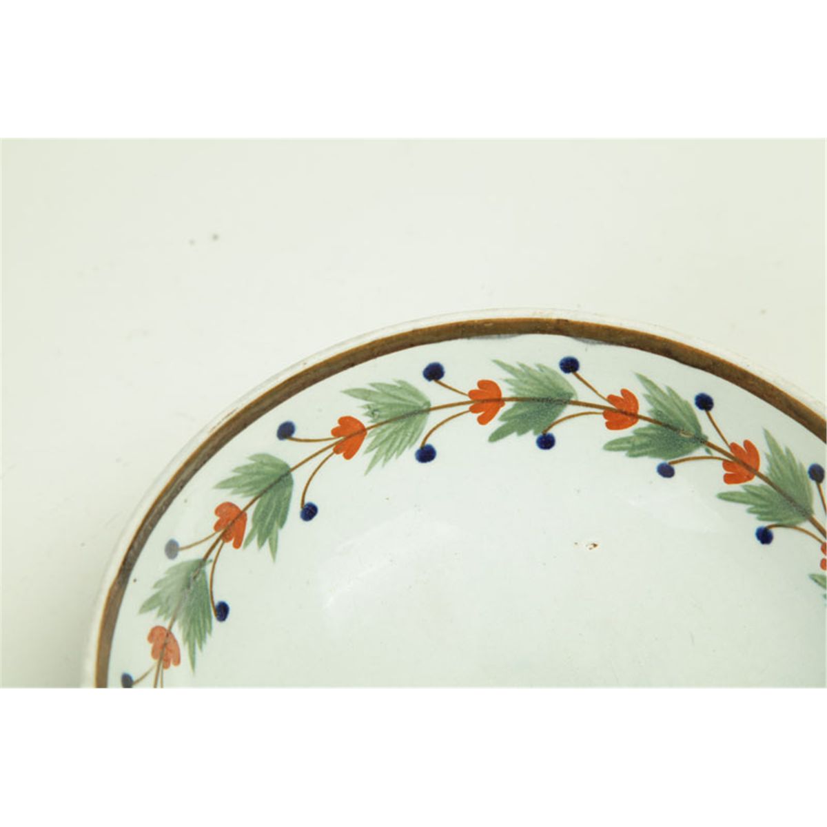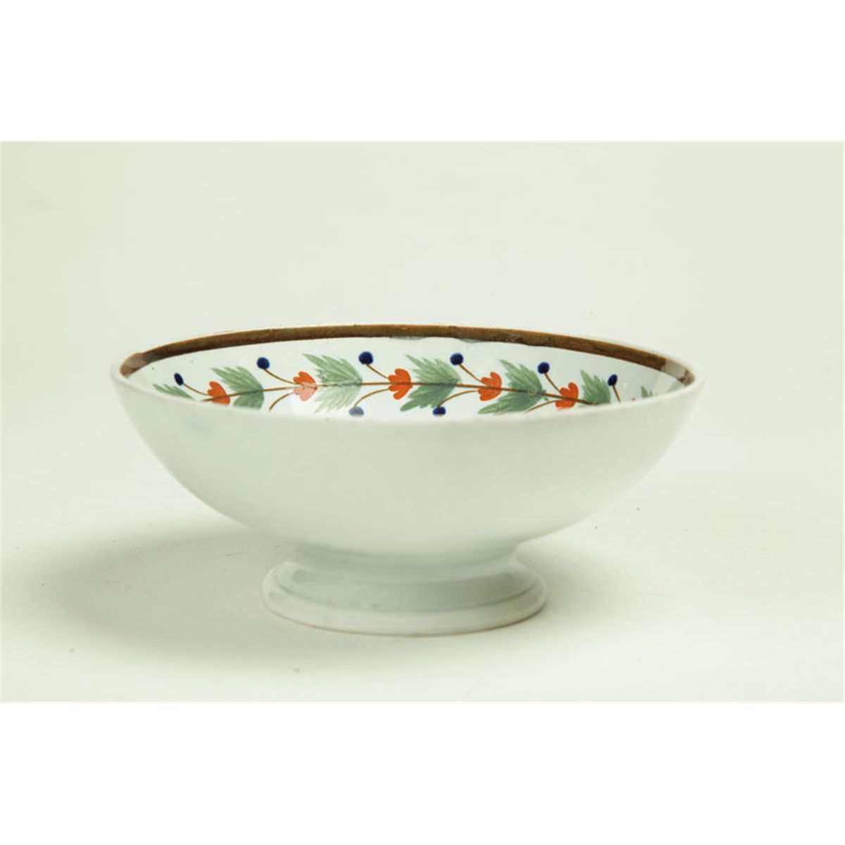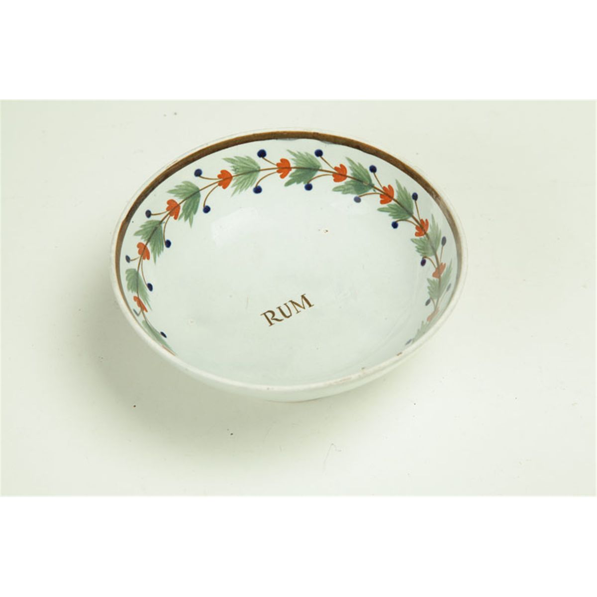 England, early 19th century. Leeds bowl with leaf and berry rim and "RUM" at center. Footed. 6 1/4"d. Imperfections.
