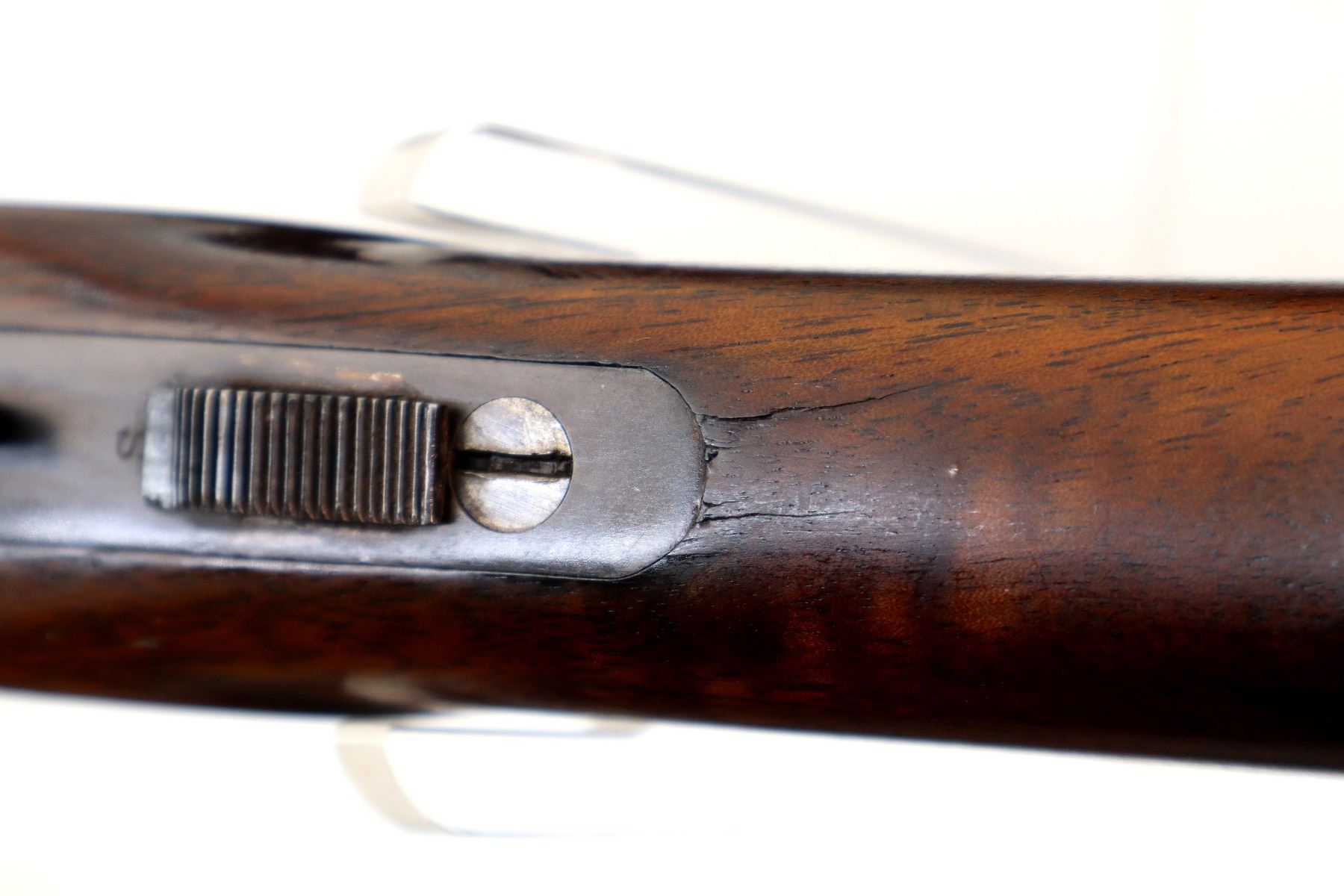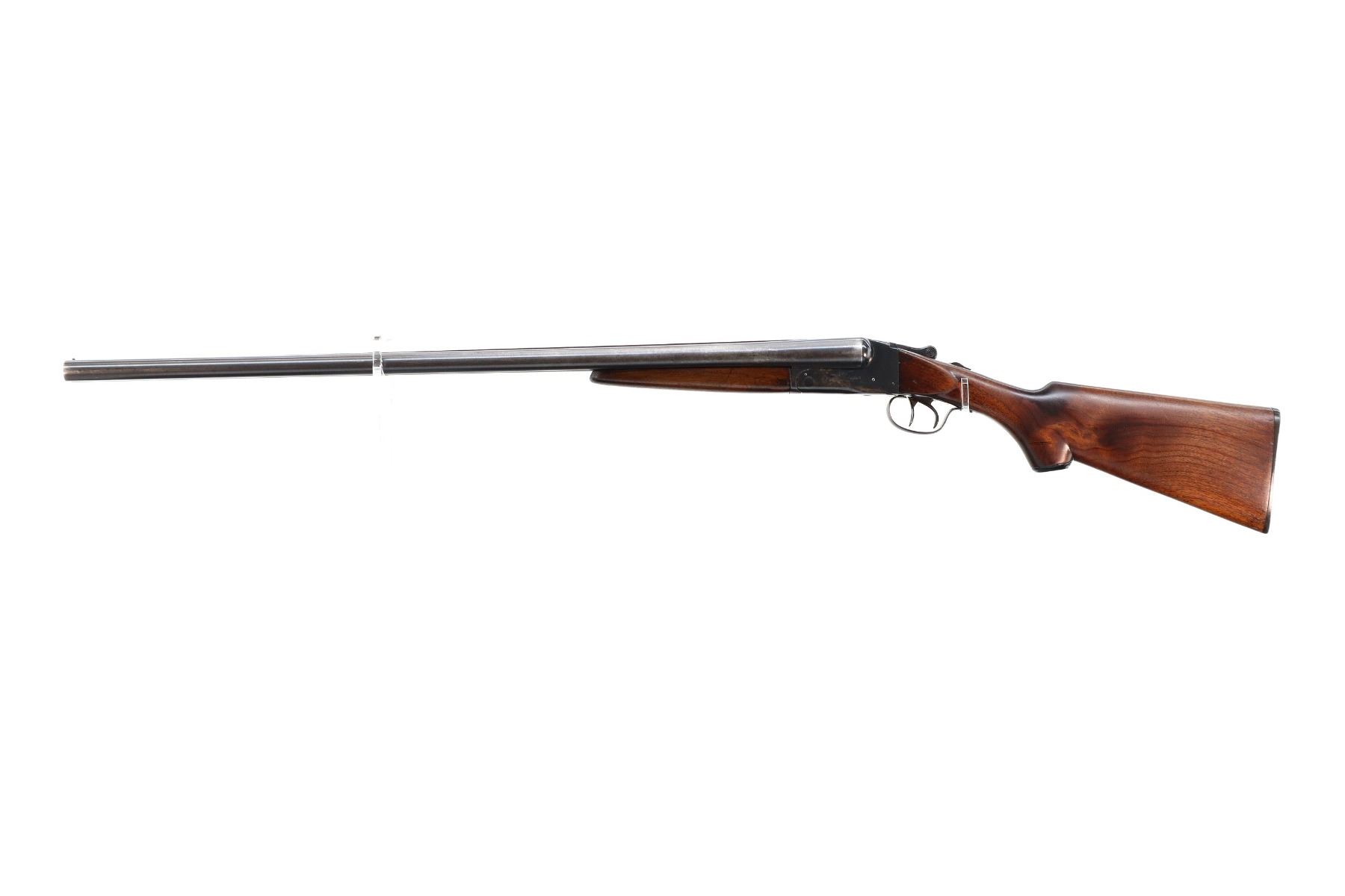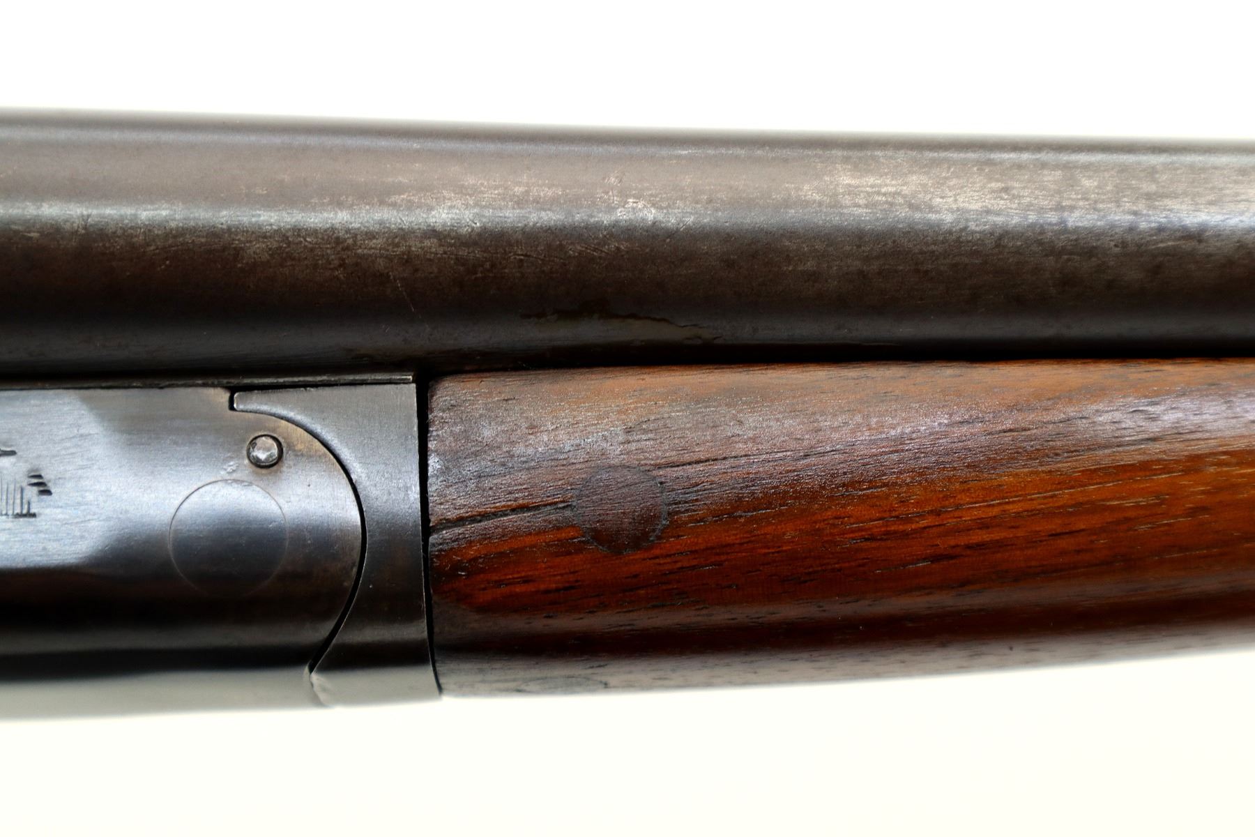 Main Description: Brass bead, blued finish, solid rib on barrels that chime and are tight on face, automatic safety, extractor, double triggers. Two piece wood stocks, forearm is cracked and repaired, pistol grip, small cracks behind receiver and upper tang, grooved brown polymer butt plate, 14" LOP, grip cap.