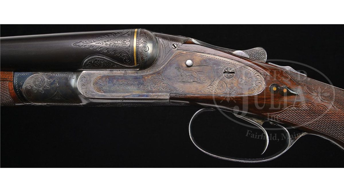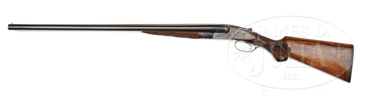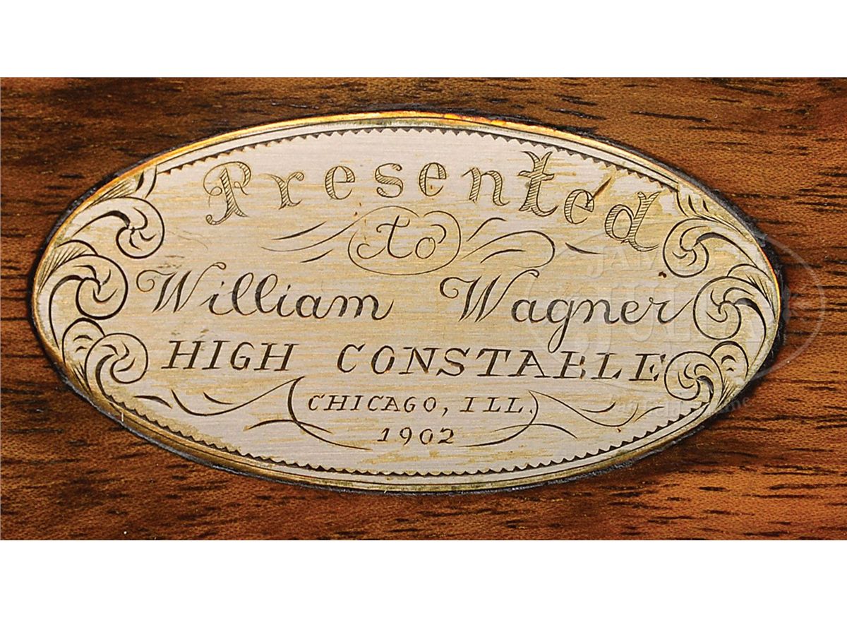 SN 37969. Cal. 12 ga. 2-3/4" Chambers. 28" bbls with flat, matted rib having gold pigeon inlaid on extension base, are engraved "Lefever Arms Co Krupp Fluid Steel" and "Presented to William Wagner 1902" on tops. Breech ends of bbls are decorated with an inlaid gold band, 2" triangles of acanthus scroll, and incised cyma curved flourish in the style of that found on Lefevers grade D and above. Bottoms of bbls are stamped with SN and additional number "53601". Case hardened ejector action with late type cocking hook, is fitted with non-automatic safety, and what appears to be Lefever single selective trigger, with selector on left side of top tang. Action is engraved with flourishes of scroll, geometric borders, and single dog in oval on each lockplate; a pointer on left, setter on right (as is most usually found on guns of E grade). Lightly streaked European walnut capped pistol grip buttstock measures 13-1/4" over original Lefever hard rubber buttplate. There are ivory inlaid horn "clock hand" drop points behind each lockplate, and grip is checkered in very fancy style with crenelated borders and ribbons through pattern. A silver plated oval on right side of butt is engraved "Presented to" "William Wagner" "High Constable" "CHICAGO, IL 1902". Matching splinter forend has friction release. Bore diameter: left-.729, right -.729. Bore restrictions: left -.005 (IC), right -.005 (IC). Wall thickness: left -.042, right -.039. Drop at heel: 2-5/8", drop at comb: 1-9/16". Weight: 7 lbs. 7 oz. LOP: 13-1/4". CONDITION: Excellent, as refurbished and augmented. Metal parts retain nearly all good quality blue and re-color. Buttstock retains considerable amount of what appears to be its orig finish with some oil rubbed in. Checkering is as new. The presentation plaque on stock appears original. Replaced forend wood matches well. 4-48888 MGM162