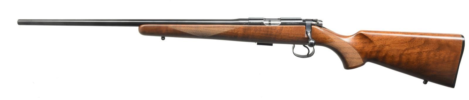 Cal. .22 LR. S# B493841. 22" Bbl. w/out sights. Left hand bolt action w/ top cut for a scope is marked w/ manufacturer & importer on right side & “MADE IN CZECH REPUBLIC” on left. Left hand bolt action w/ 5 shot mag. Pistol grip stock of lightly figured European walnut features hard rubber buttplate, sling eyes & checkering at grip & on forend. UNATTACHED ACCESSORIES: brown & black cardboard box w/ end label for this rifle. CONDITION: very fine, very close to “as new” w/ only a few very faint handling & assembly marks in all factory finishes. Box is very fine. (20-4134/MGM). MODERN. $300-500.