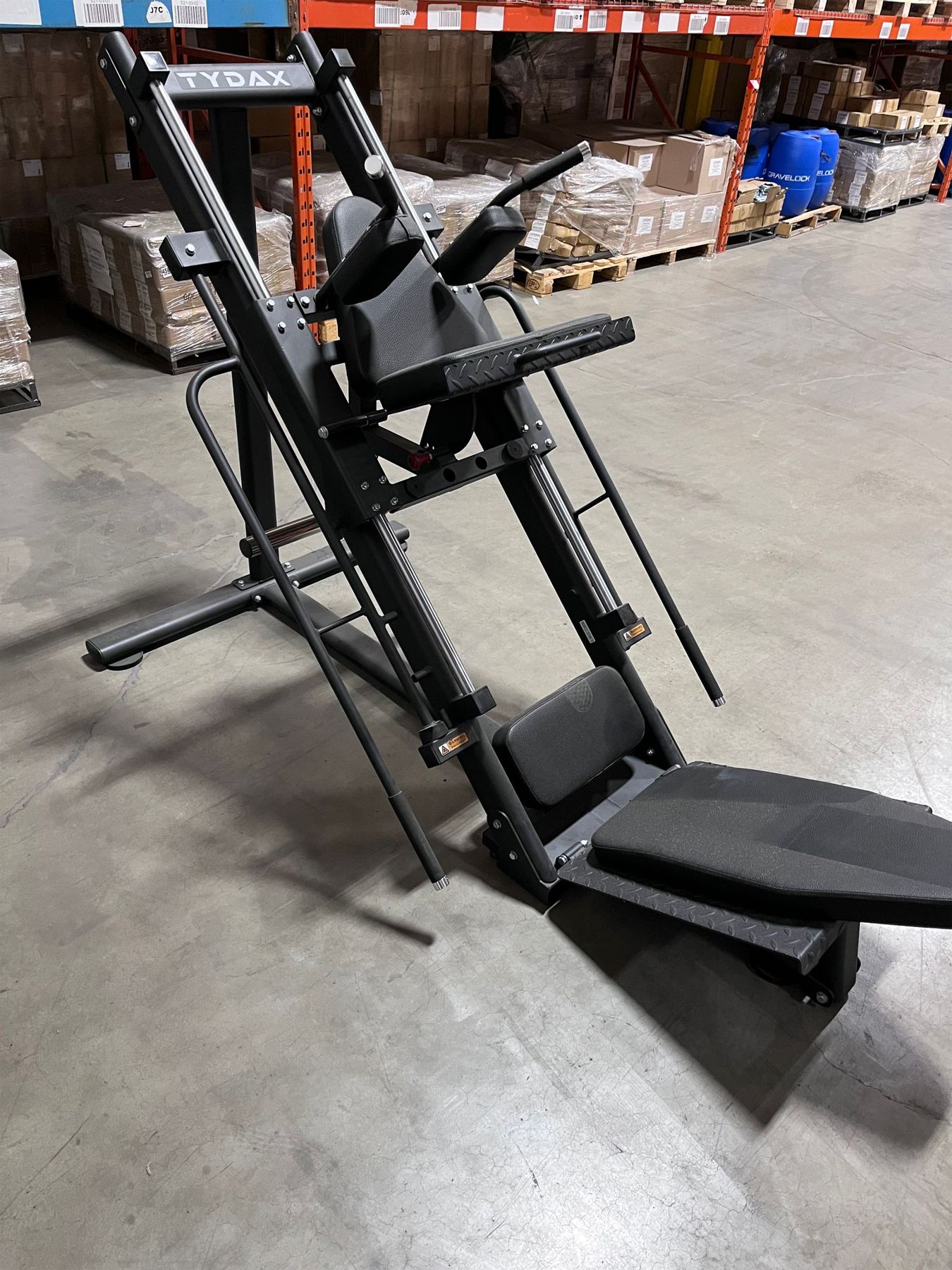 WITH A MAXIMUM WEIGHT LOAD OF 800 POUNDS AND A TOUGH BLACK DOUBLE POWDER COAT FINISH, THE TYDAX LEG PRESS AND HACK SQUAT IS BUILT LIKE AN ABSOLUTE BEAST. IT’S EXTREME DURABILITY AND SUPER SOLID CONSTRUCTION MAKE IT THE PERFECT APPARATUS TO BUILD AN EXPLOSIVE AND DYNAMIC LOWER BODY. THE INTUITIVELY ENGINEERED DESIGN ALLOWS THE USER TO MOVE FROM LEG PRESS TO SQUAT/ SQUAT TO LEG PRESS WITH A QUICK AND EASY PIN-LOADED ADJUSTMENT. THE EXTREME SMOOTHNESS OF THE TYDAX LEG PRESS AND HACK SQUAT ALLOWS THE ATHLETE TO DEVELOP THEIR GLUTES, QUADS, HAMSTRINGS AND CALVES WHILE RELIEVING YOUR JOINTS OF THE GREATER DEMANDS OF A TRADITIONAL SQUAT. THE ADJUSTABLE WEIGHT STACK ALLOWS ATHLETES OF ALL SIZES AND TRAINING LEVELS TO BENEFIT FROM THE RESISTANCE TRAINING OFFERED BY THE LEG PRESS AND HACK SQUAT. WITH A STITCHED VINYL FINISH ON ALL CUSHIONS PROMISES DURABILITY TO THE DEMANDS OF LIFTING HEAVY LOADS. SPECS: OVERALL DIMENSIONS: 45” W X 88” D X 60” H, MAXIMUM WEIGHT LOAD: 800LB, FRAME: 50 X 100 X 2.5MM HEAVY-GAUGE FLAT OVAL TUBING, HIGH QUALITY ELECTROSTATIC POWDER COAT FINISH. A STANDARD TWO-COAT POWDER COATING THAT’S HIGHLY RESISTANT TO CHIPS AND SCRATCHES, INTUITIVE COLOR CODED AND SPRING-LOADED PULL-PIN FOR QUICK AND EASY ADJUSTMENTS, CUSHIONS: DURABLE HIGH-DENSITY CUSHION COVERED IN STITCHED VINYL, NON-ABSORBING PVC COMPOUND RETAINED GRIPS WITH ALUMINUM COLLARS, HIGH DENSITY PVC FOOT GUARDS, CHROMED PLATE HOLDERS AND BAR SUPPORTS TO PROTECT THE POWDER COATED FRAME’S FINISH WELL.