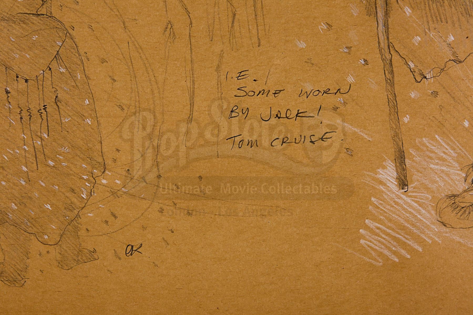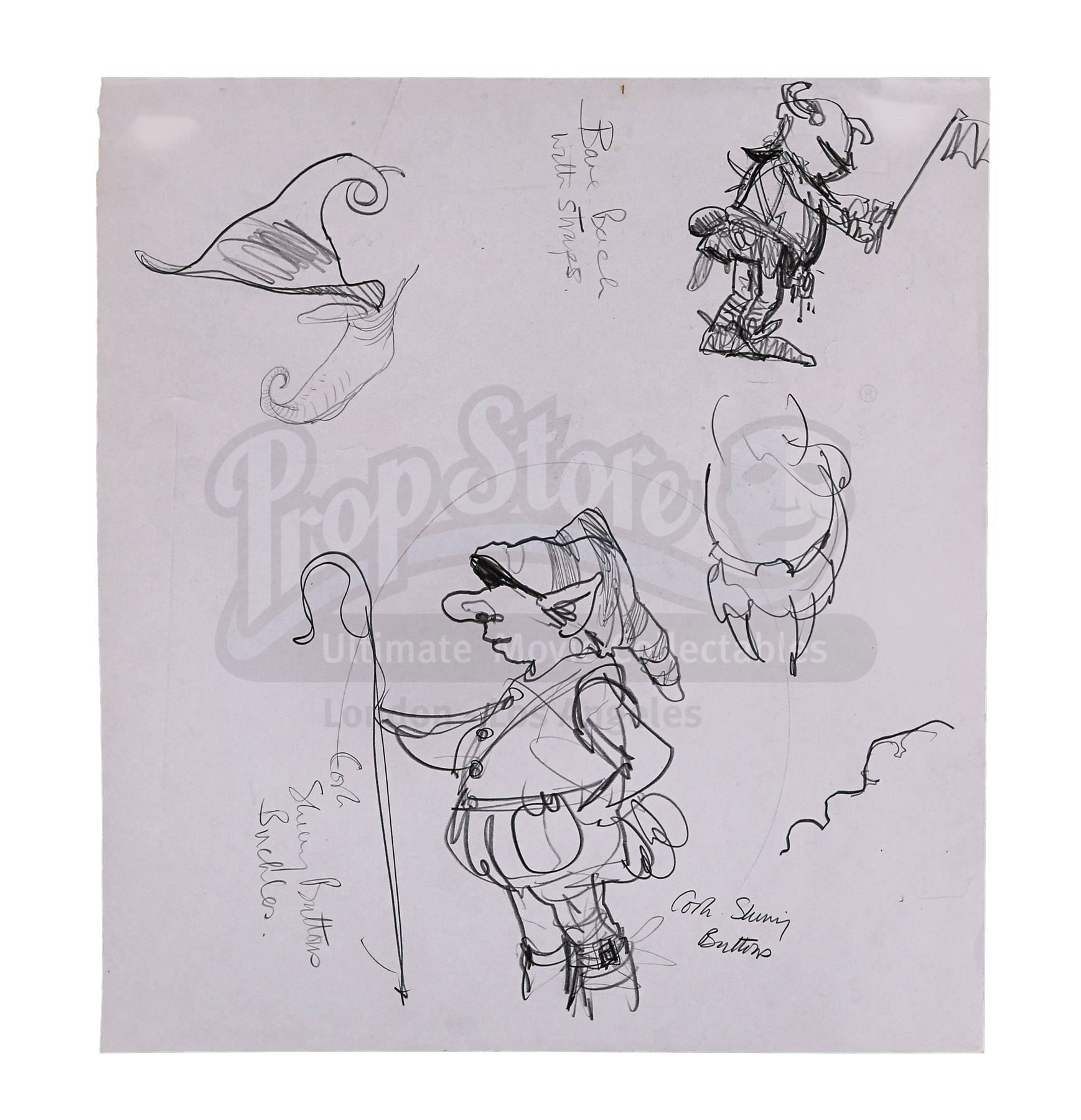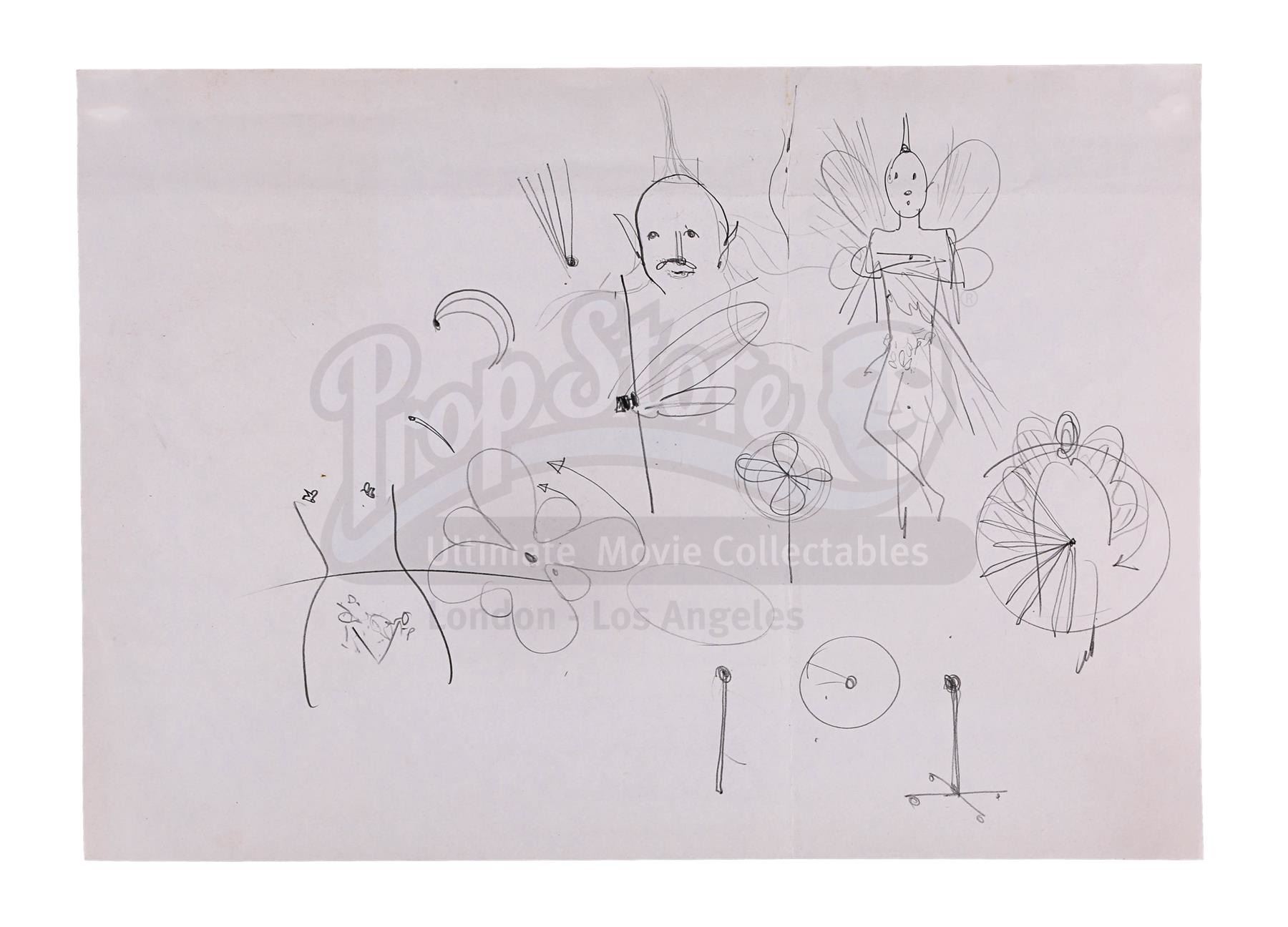 The 10 hand-drawn pencil sketches depict costume concepts and key design choices, such as Darkness' (Tim Curry) cape; Lili's (Mia Sara) dresses; Gump's (David Bennent) shoes; various pixie and dwarf looks; two designs for Death's Ghost; frozen traveler clothes for Jack (Tom Cruise); and a set of "Frozen Life" sketches. The drawings show minimal wear from production use, displaying slight tears to the corners and edges. Dimensions (largest drawing): 61 cm x 49 cm x 0.1 cm (24" x 19 1/4" x 1/8")