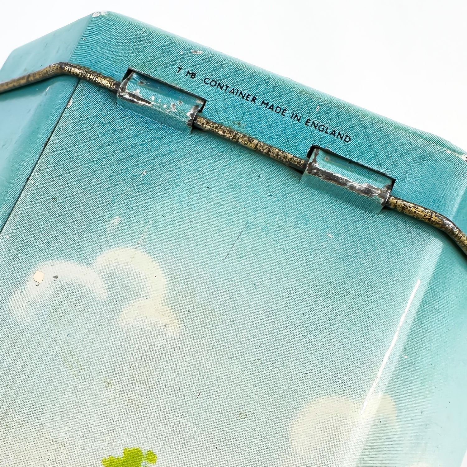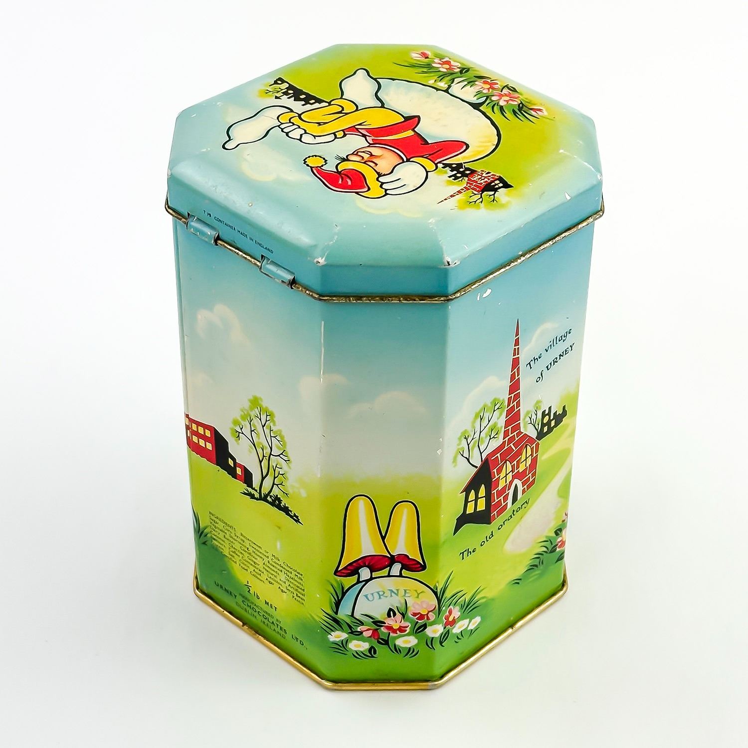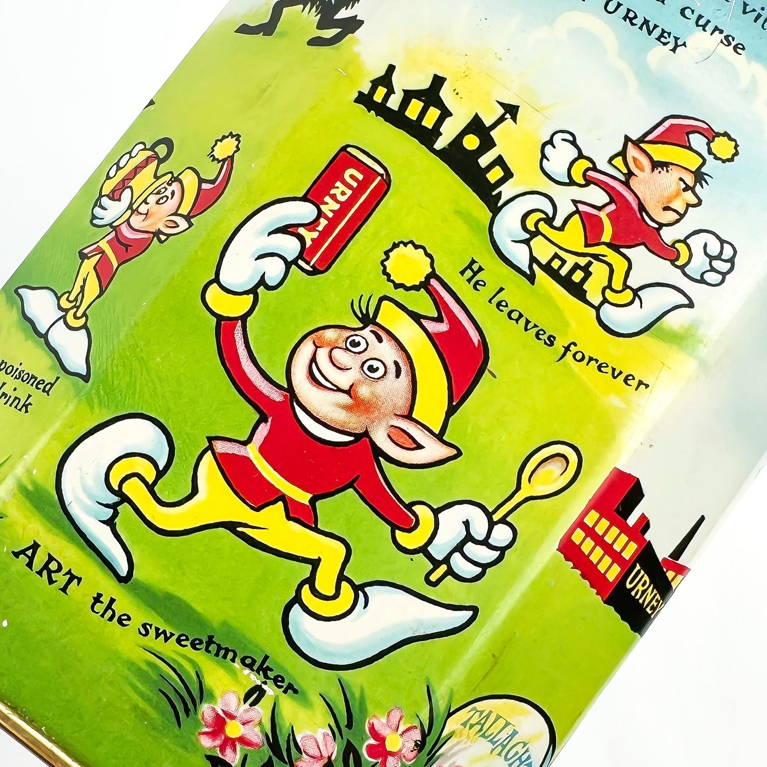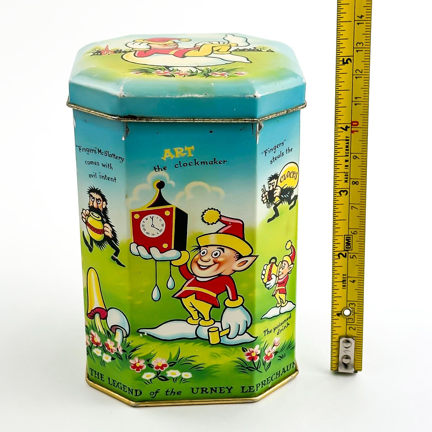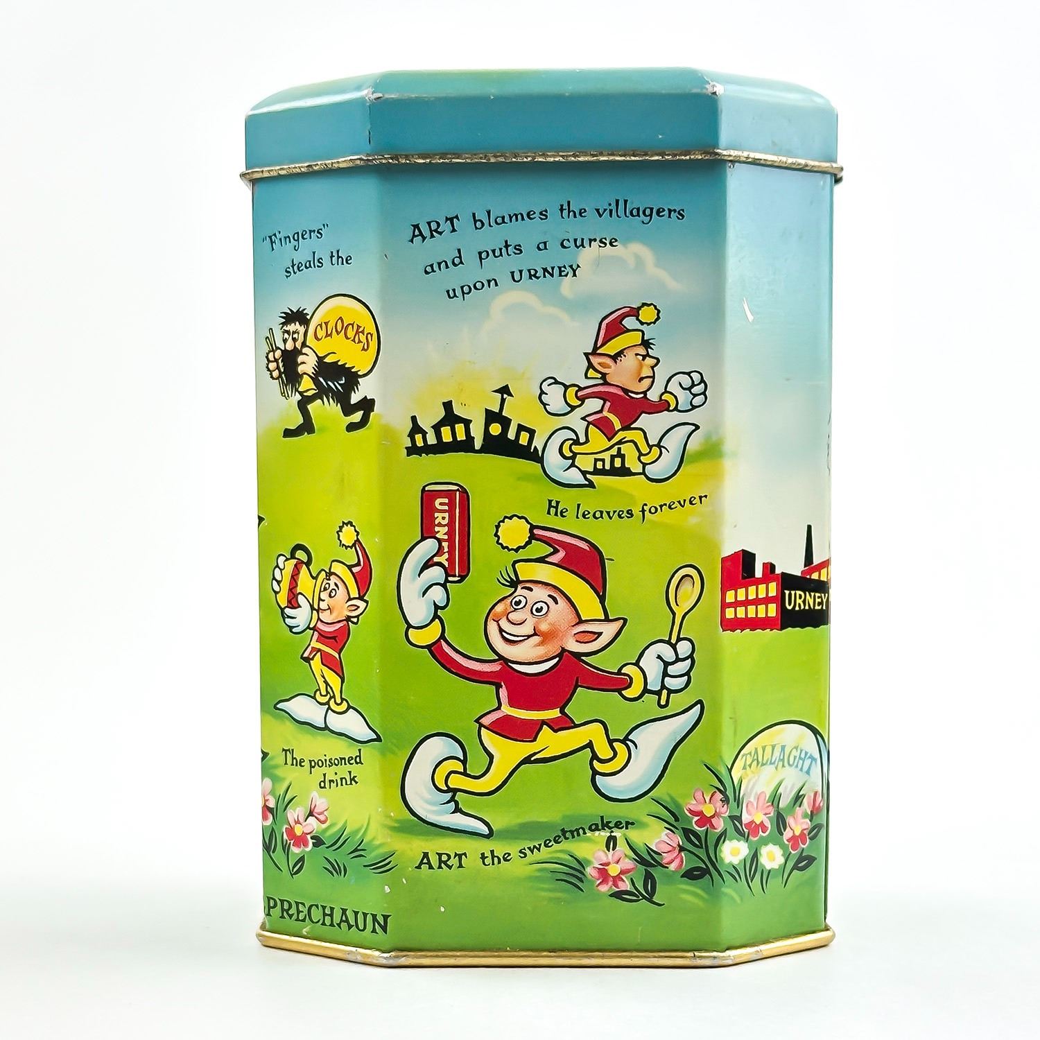 #8009 - VINTAGE 1/2 LB. NET URNEY CHOCOLATES LTD. DUBLIN, IRELAND METAL ADVERTISING TIN CAN. CARTOON COMIC GRAPHICS OF URNEY ALL AROUND THE TIN. NICE CLEAN TIN - BOTH TIN AND GRAPHICS ARE IN GREAT SHAPE. MEASURES: 5”(12.5 CM) TALL BY ROUGHLY 3.5” (9 CM) SQUARE