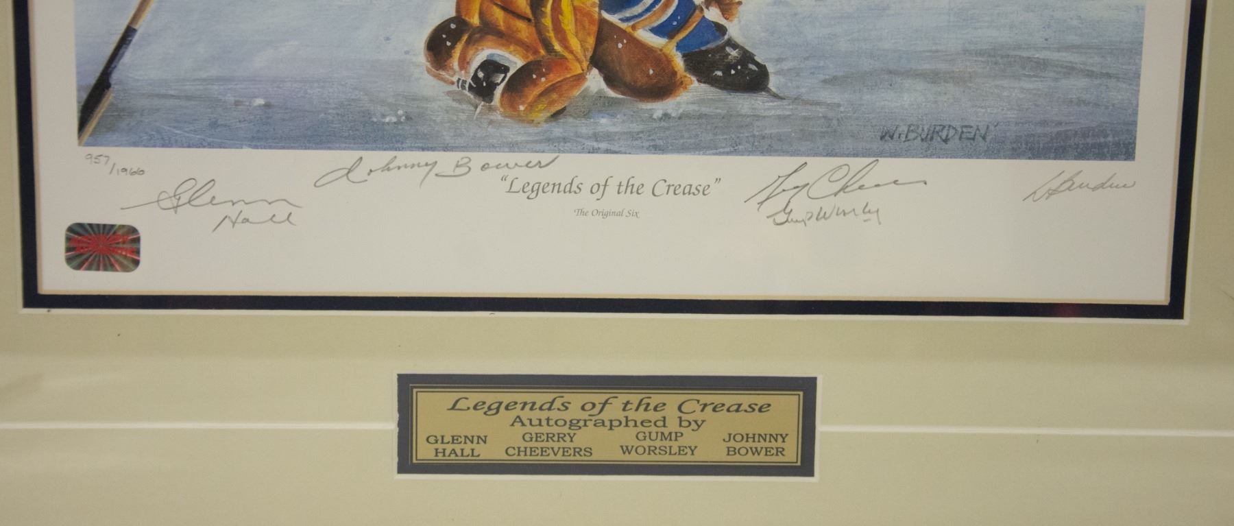 CUSTOM FRAMED 26.5" X 20.5" - IT IS SIGNED BY ALL 4 GOALIES GLENN HALL, JOHNNY BOWER, GERRY CHEEVERS, AND GUMP WORSLEY- IT IS A NUMBERED PRINT #957 OF 1966