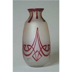 Lot 1254 LEGRAS CAMEO & ENAMEL VASE. Large LeGras vase has cameo stylized ribbon design against a frosted chipped ice background. The ribbon design is crudely enameled in maroon. Signed in cameo “LeGras” in enamel to match. SIZE: 12-1/2” t. CONDITION: Very good to excellent. 5-69076 (300-500)