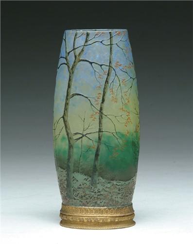 LEGRAS CAMEO VASE. Scenic cameo and enamel decoration of trees with leaves in colors of green and brown on a green, yellow and blue mottled background. Signed on side of vase "Legras". Metal gold washed base. SIZE: 6-1/2 in. t. CONDITION: Metal base has dent, otherwise very good to excellent. 5-60629