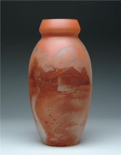 LEGRAS ENAMELED VASE. Monumental Legras vase has an enameled scene of cabin in a meadow next to woods with smoke extending from chimney, all done in shades of orange. Signed on the side "Legras". SIZE: 14-3/4 in. t. CONDITION: Very good to excellent. 5-61095