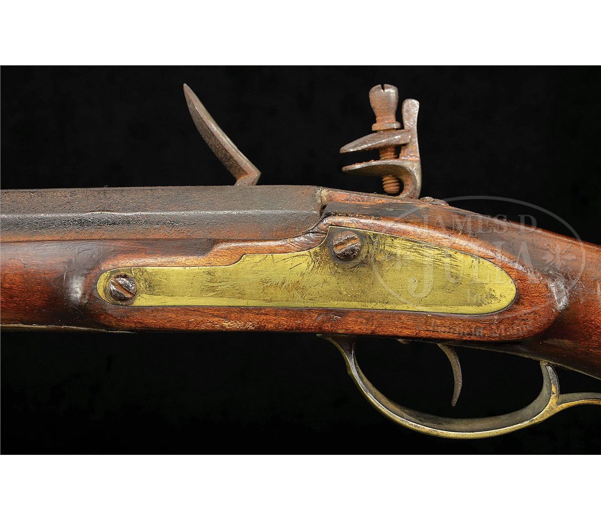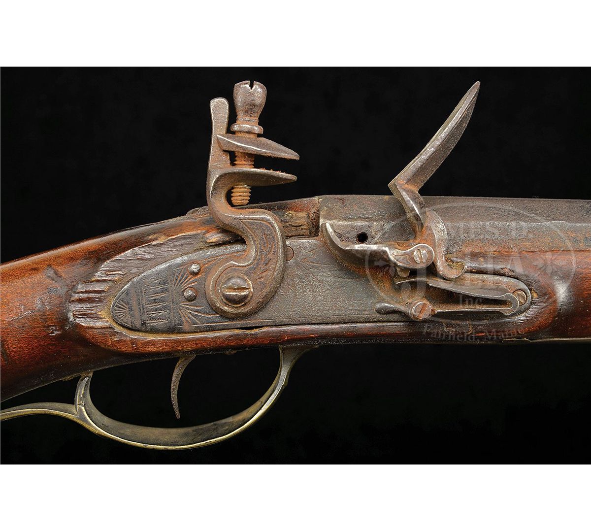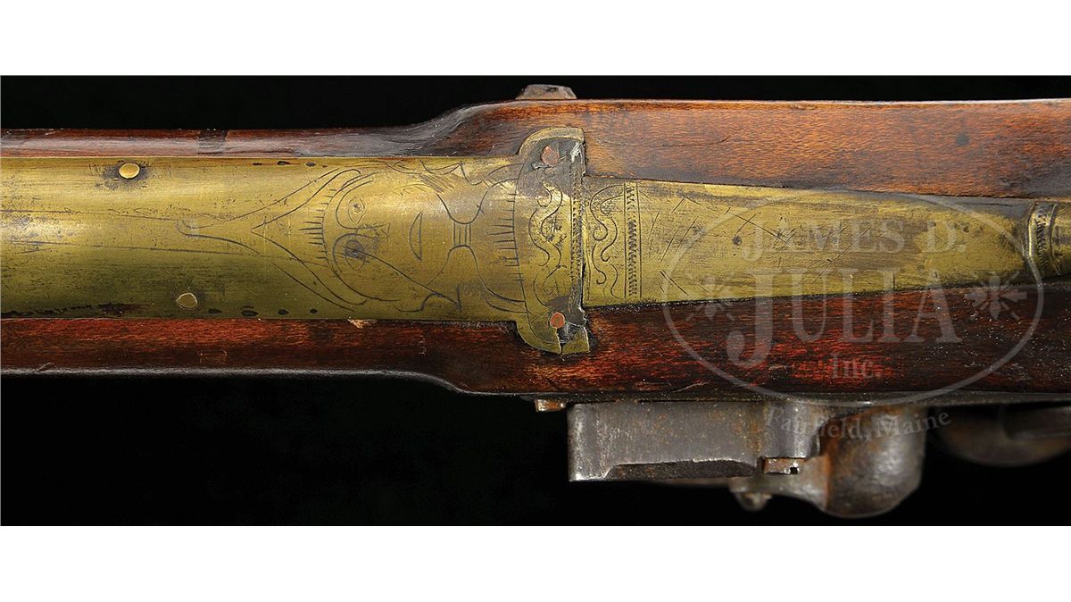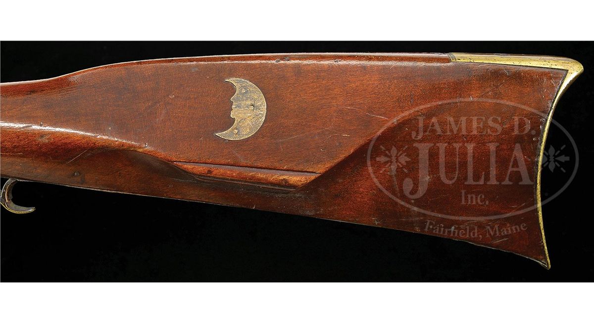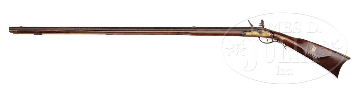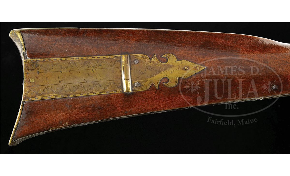 NSN. Cal. .52 smoothbore. Rifle has a 43-3/4" full oct engraved unsigned bbl. It is universally thought the gunsmith is Henry Clause, father of the gunsmith Nathanial Clause. Henry Clause is listed in the Lehigh County tax list of 1821. Rifle has the traditional 2-piece engraved brass patch box with fleur-de-lis finial. Rifle has a full brass saddle plate with the very desirable Lehigh County “Indian Head” engraved forward of the trigger guard. Rifle has a silver half-moon cheek piece inlay, three wrist inlays and a full brass side plate and full brass toe plate. PROVENANCE: Collection of Woody Frey. CONDITION: Generally very good as restored. Lock is in need of adjustment and bbl has been professionally stretched about 10". Restoration is well done and difficult to see. 4-48504 RG21