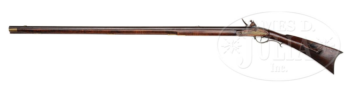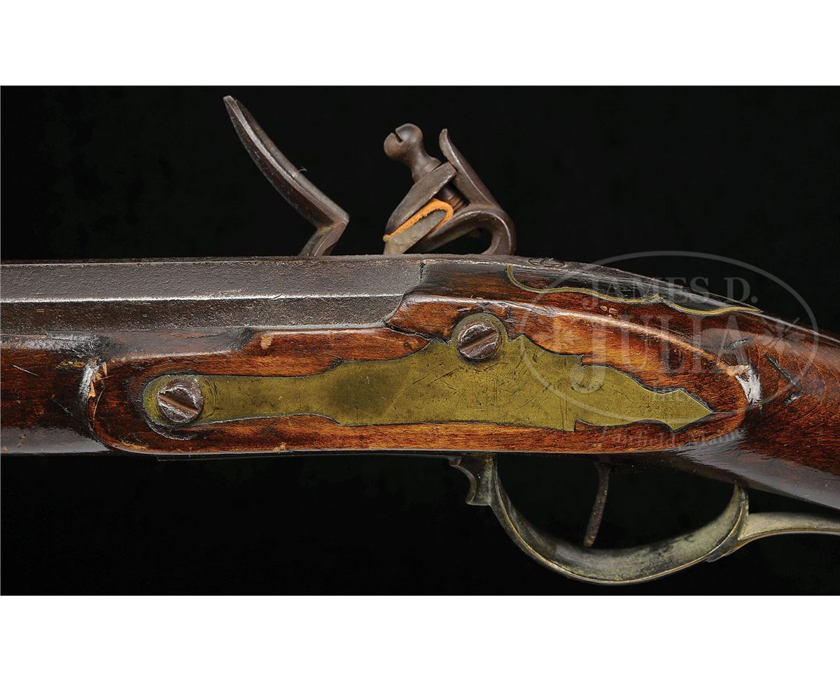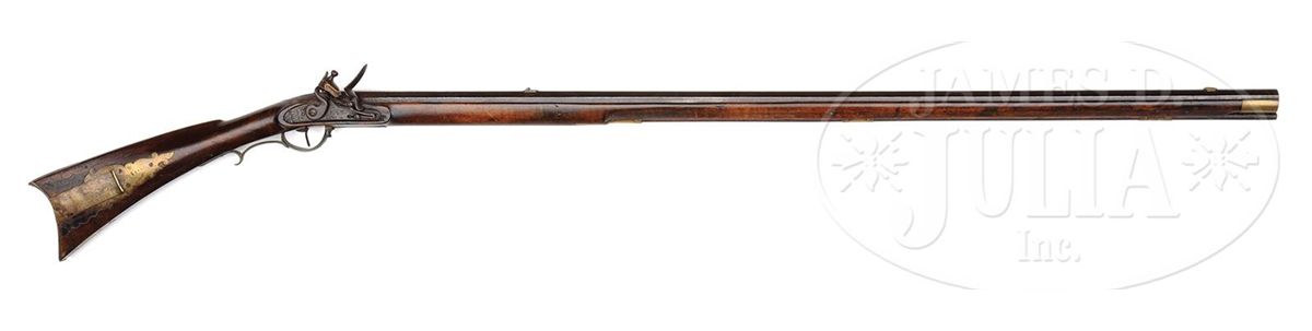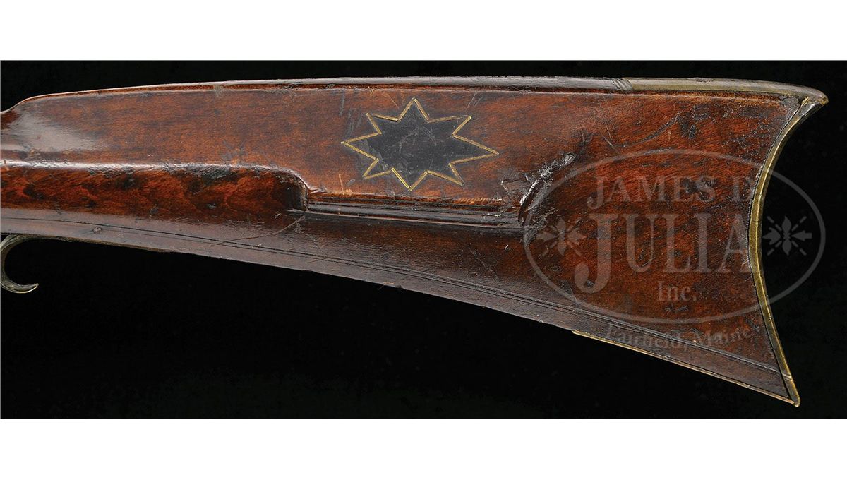 NSN. Cal. .45 smoothbore. This rifle has a 42" full oct unsigned bbl. Henry Hunsicker worked in Macungie Township, Lehigh County later relocating to Snyder/Union County where he died. 4-piece engraved patchbox has brass wire inlay on the side panels with attractive black stain between the wire and the patchbox. There is brass wire inlay around the bbl tang again with black stain between the wire and the tang. Brass eight pointed star cheek piece inlay features the black stain as well. This use of black stain to decorate the rifle was used extensively by the Hellerstown Molls as well as Hunsicker on some of his signed rifles. Brass arrow back side plate is the typical Lehigh Valley school design and the toe plate features a horn patch box release. PROVENANCE: Collection of Woody Frey. CONDITION: Generally very good. There is a small piece of wood missing between the lock and the bbl tang and an old crack in the stock forward of the rear ramrod ferrule. 4-48495 RG12