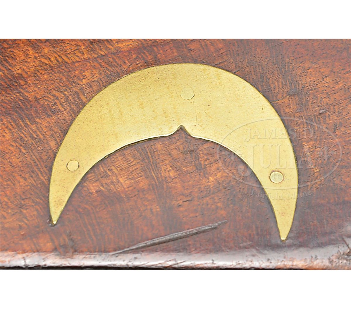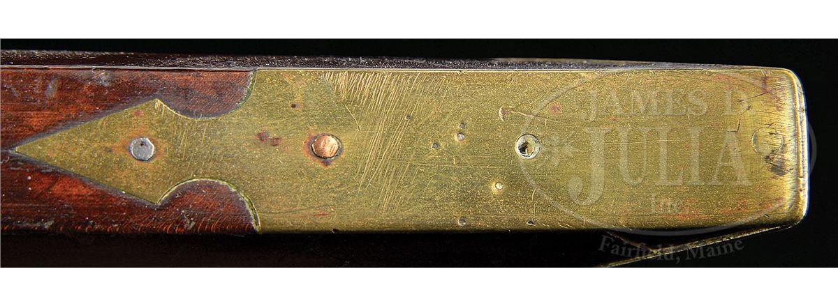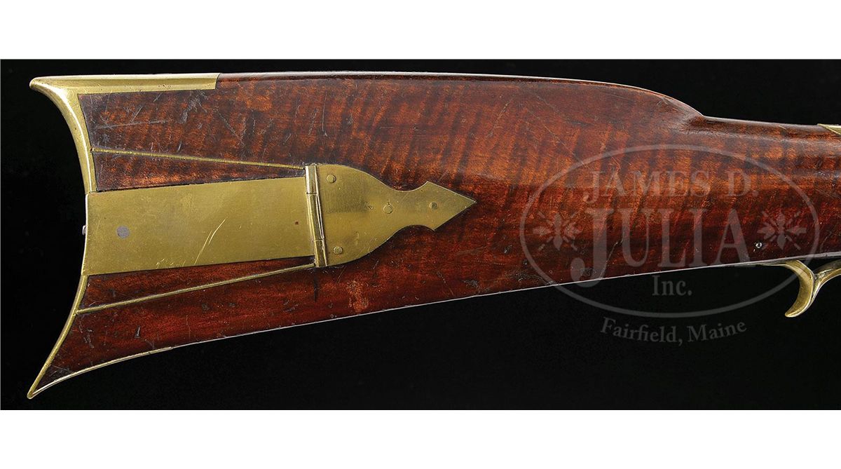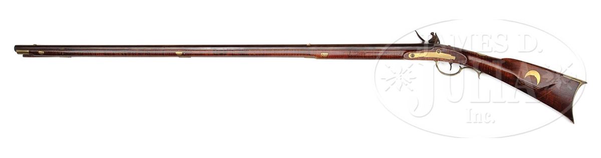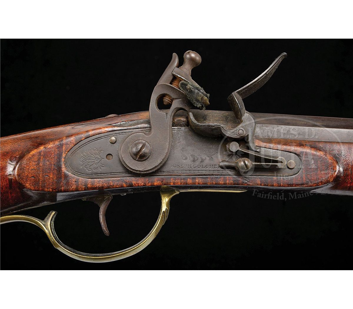 NSN. Cal. .45 smoothbore. Rifle has a 42-3/4" full oct smooth unsigned barrel. Rifle has a 4-piece brass patchbox and a curly maple stock. Flintlock is marked Josh Golcher and the toe plate has a Lehigh County arrow back finial. Silver half-moon cheek inlay, the bbl tang and all the hardware are typical of Hess family rifles. PROVENANCE: Collection of Woody Frey CONDITION: Rifle is in excellent condition throughout. 4-48507 RG25
