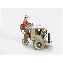 Lot # 737 LEHMANN LI LA. This toy depicts a handsome horseless cab, traveling down the street with the driver sitting behind the carriage containing two women and a dog. When wound, the women rock back and forth and the dog turns to and fro with one of the ladies pretending to swat the dog with her umbrella. SIZE: Approx. 6" h. CONDITION: The lithograph has faded somewhat and the figures appear to have some touch up. 1-29286 (500-700)
