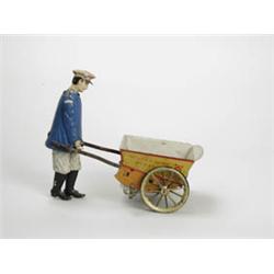 Lot # 738 LEHMANN TAP TAP. Litho and hand painted porter, pushing a wheelbarrow. SIZE: 6-1/2". CONDITION: Overall wear, but toy is in good condition. 1-29270 (200-300)