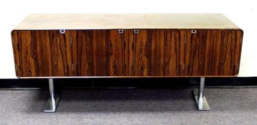 LEIF JACOBSEN - An unusual 1960's rose wood cabinet on chromed metal supports. Rectangular front with four enclosed cupboards containing mahogany shelving and drawers. Mounted with chromed metal hardware. 62" long, 20" wide and 14 1/2" high. Raised on chromed metal legs. Matching the following lot. 2500-3500