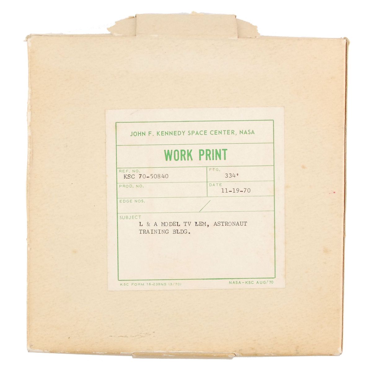 Original box of film from the Apollo project. Box measures 7 x 7, and contains one reel of 16mm film. John F. Kennedy Space Center label affixed to the cover reads, in part: “L & A Model TV LEM, Astronaut training Bldg.” In fine condition.