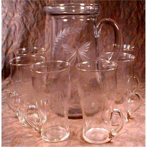 Beautiful clear etched glass butterfly lemonade set. Tall, straight pitcher and 6 soda shaped glasses with applied handles.