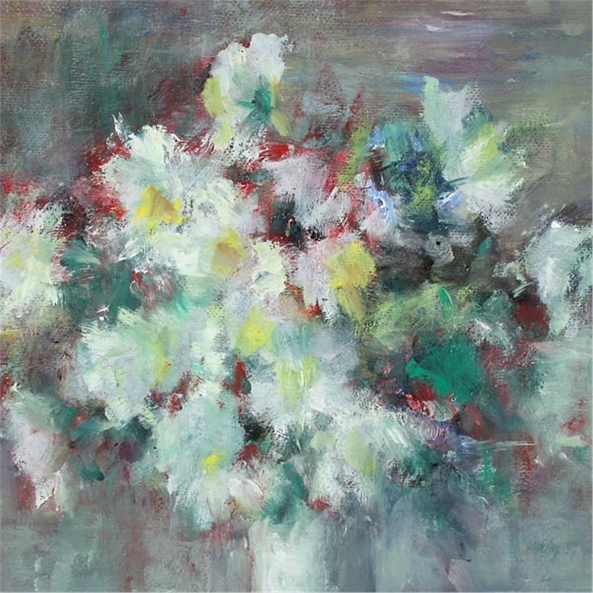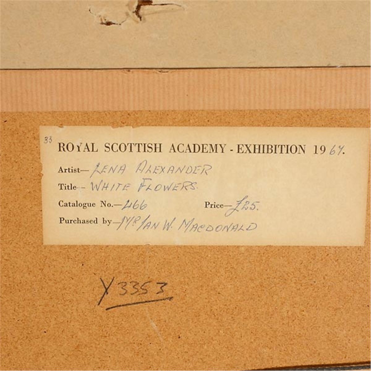 LENA ROBB-ALEXANDER (British 1891-1980) White Flowers Oil on board Sight: 15.25 x 19 inches/ 39 x 48 centimeters Signed lower right "Lena Robb" Verso: Exhibition label reading "Royal Scottish Academy- Exhibition 1964, Artist- Lena Alexander, Title- White Flowers, Catalogue Number- 466, Purchased by- Mr. Ian W. MacDonald". Second label reading: artist info. Frame: 20.75 x 24.50 inches/ 53 x 62 centimeters In good condition.  Framed